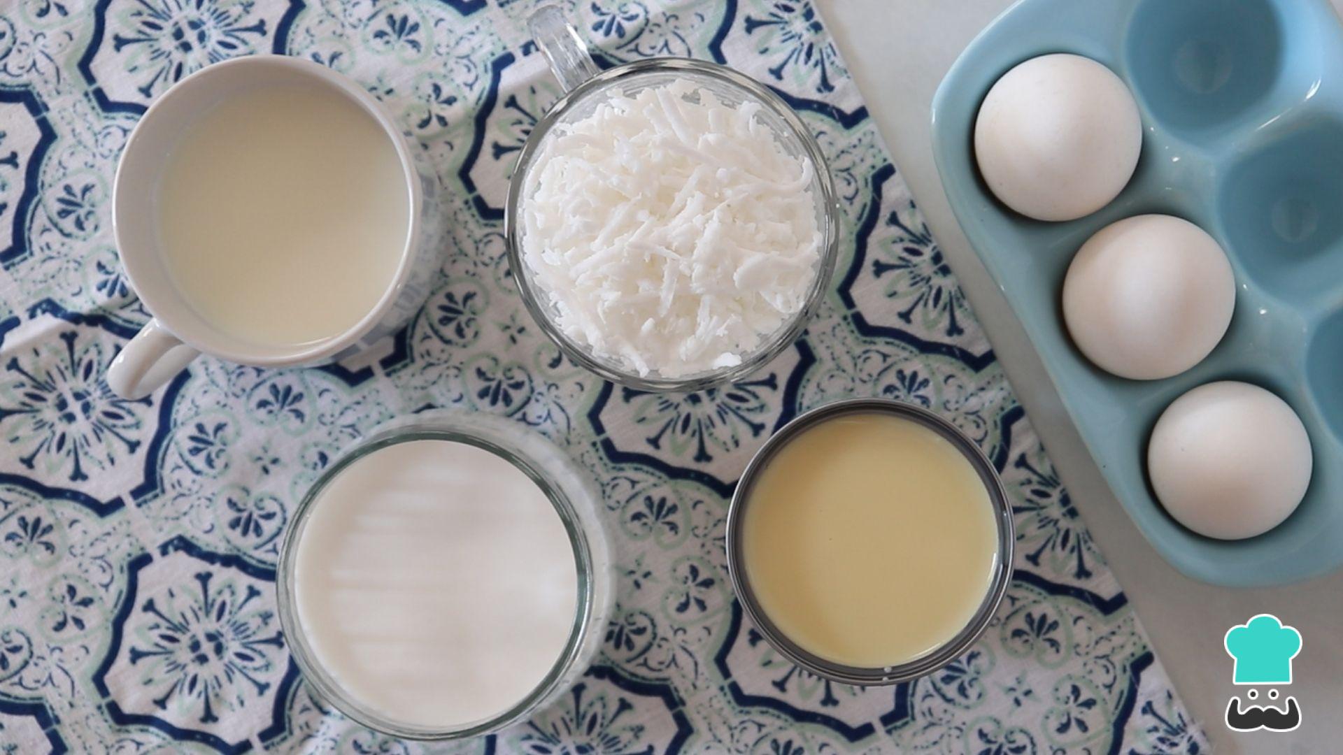 Misture o leite condensado, o leite integral, o leite de coco e os ovos em uma tigela grande.