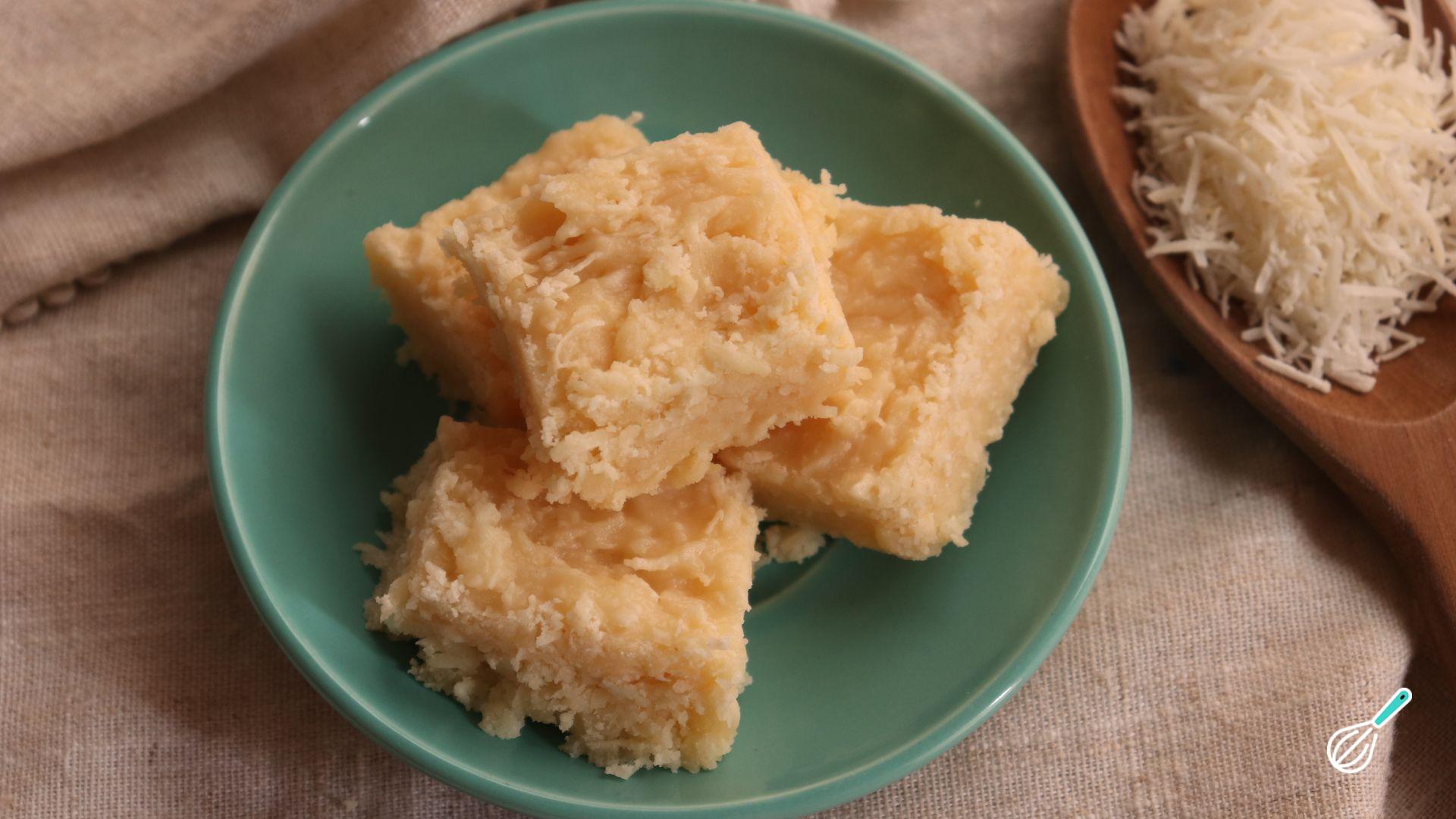 Espere esfriar e corte em quadradinhos. Sirva em seguida. Nos conte o que achou dessa receita nos comentários e poste fotos!