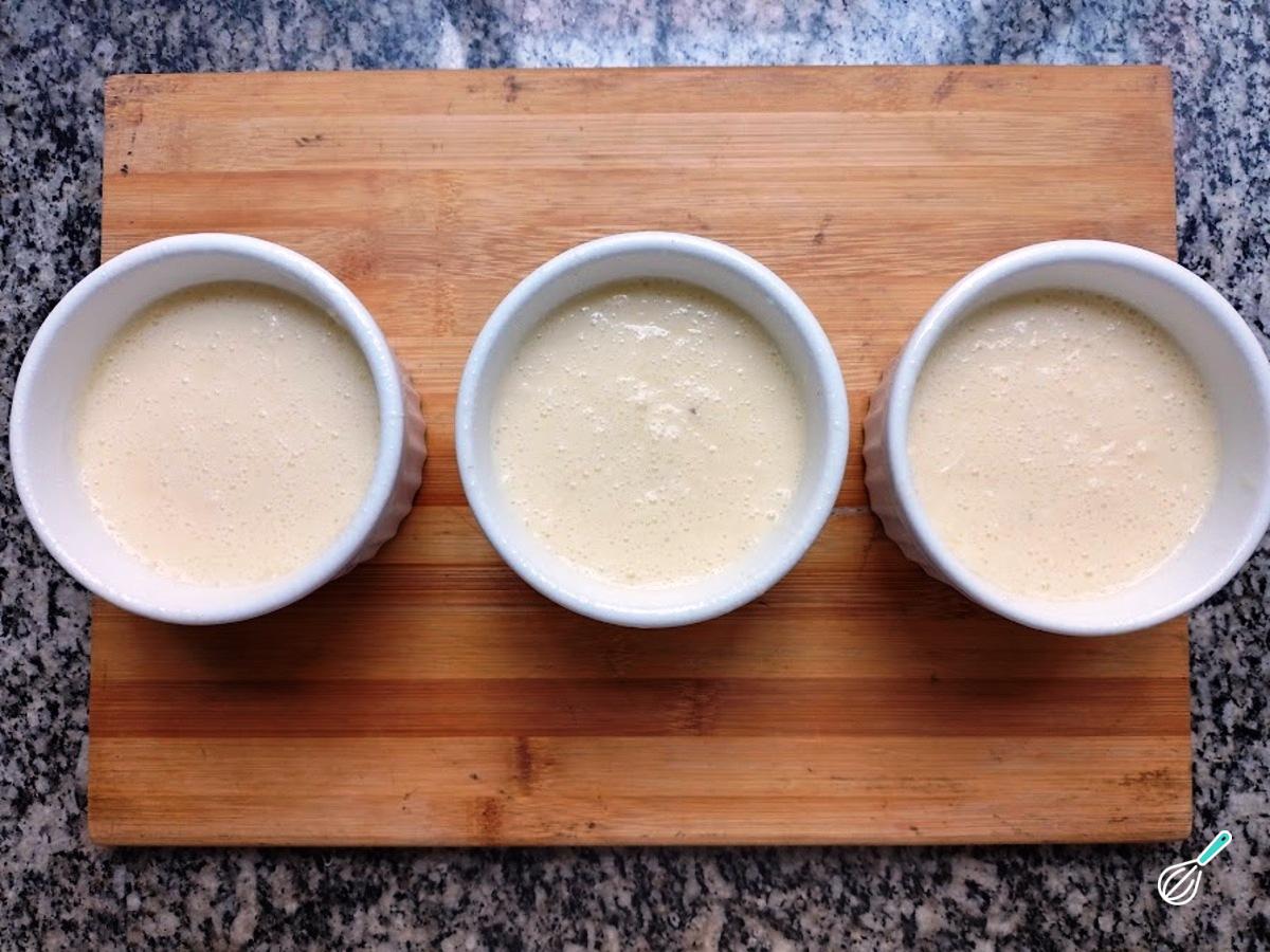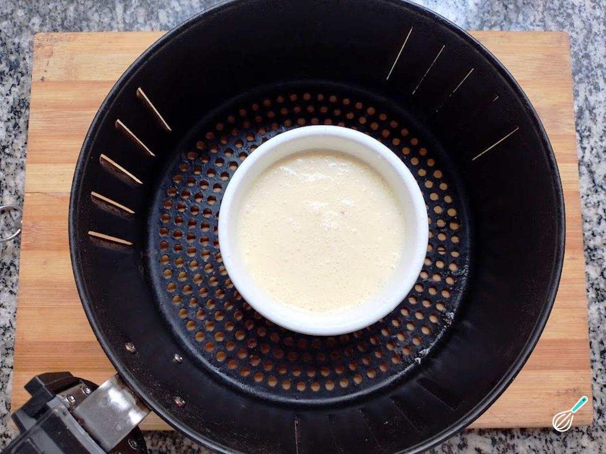 Colocar a massa em ramequins que possam ir na airfryer. Unte-os com manteiga ou desmoldante. Coloque somente até a metade da capacidade.