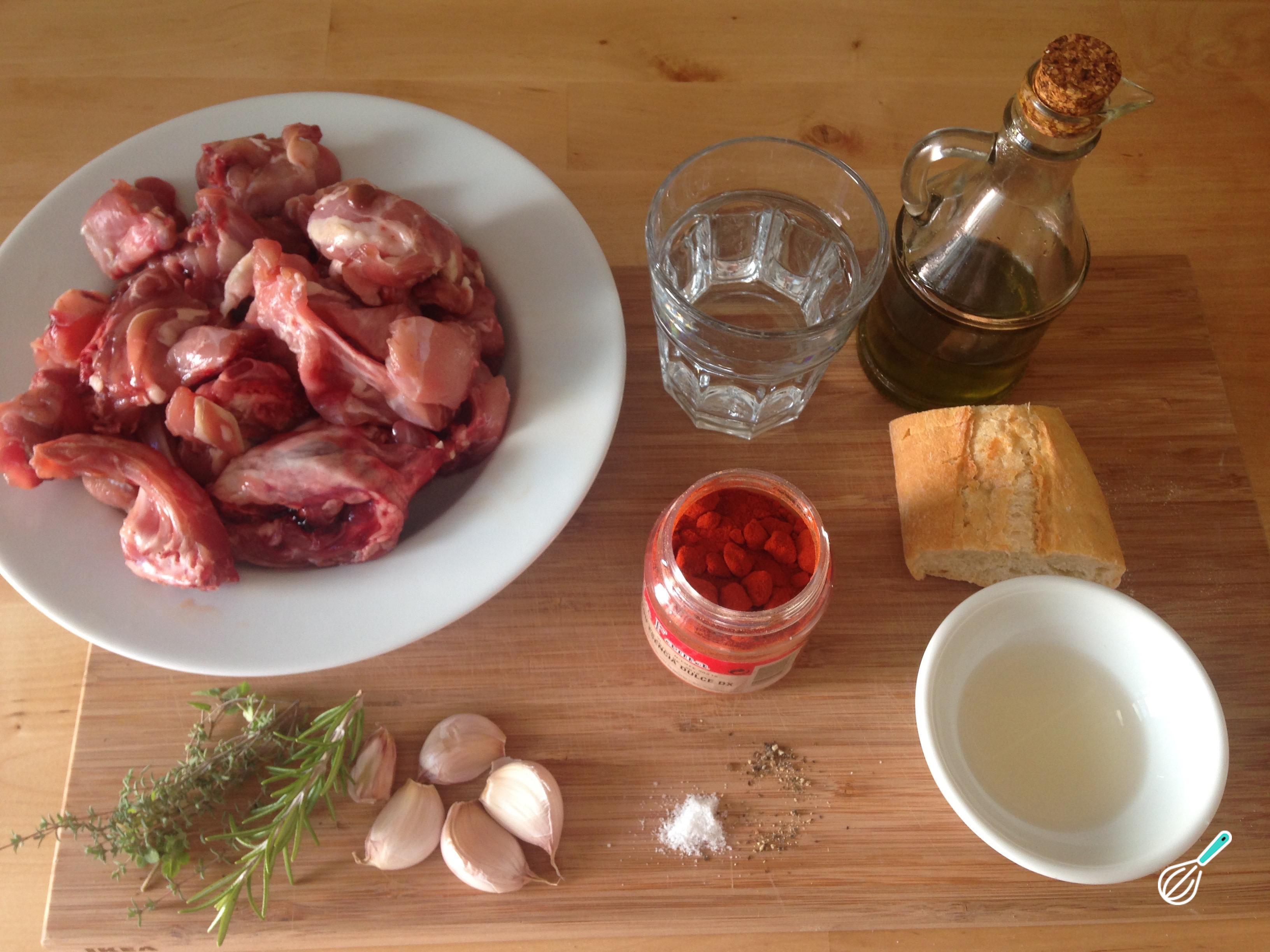 Comece por reunir todos os ingredientes para preparar o coelho ao molho simples.