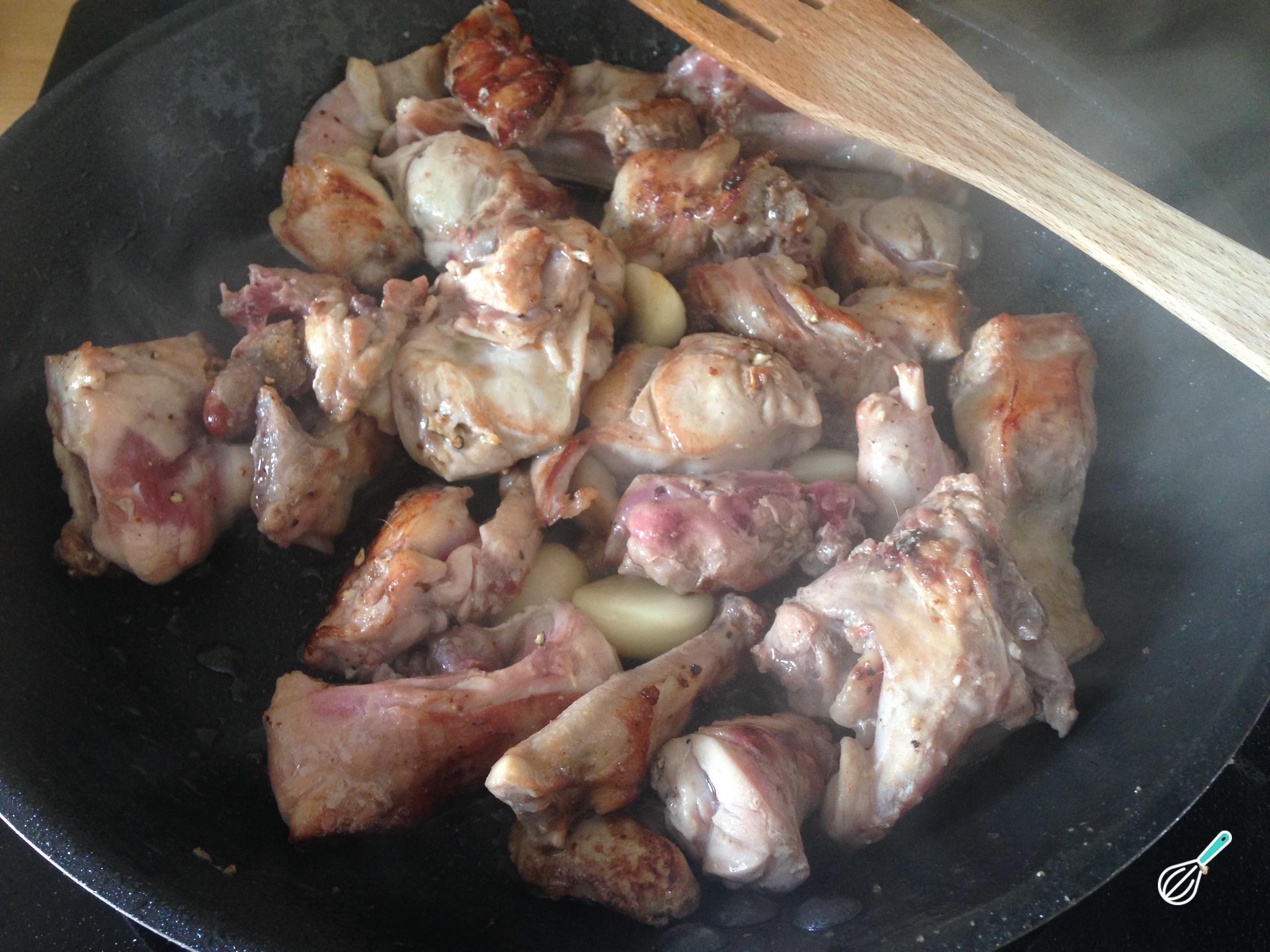 Frite o coelho em pedaços com o alho descascado em uma panela com 3 colheres de sopa de azeite de oliva. Tempere com sal e pimenta do reino e reserve.
