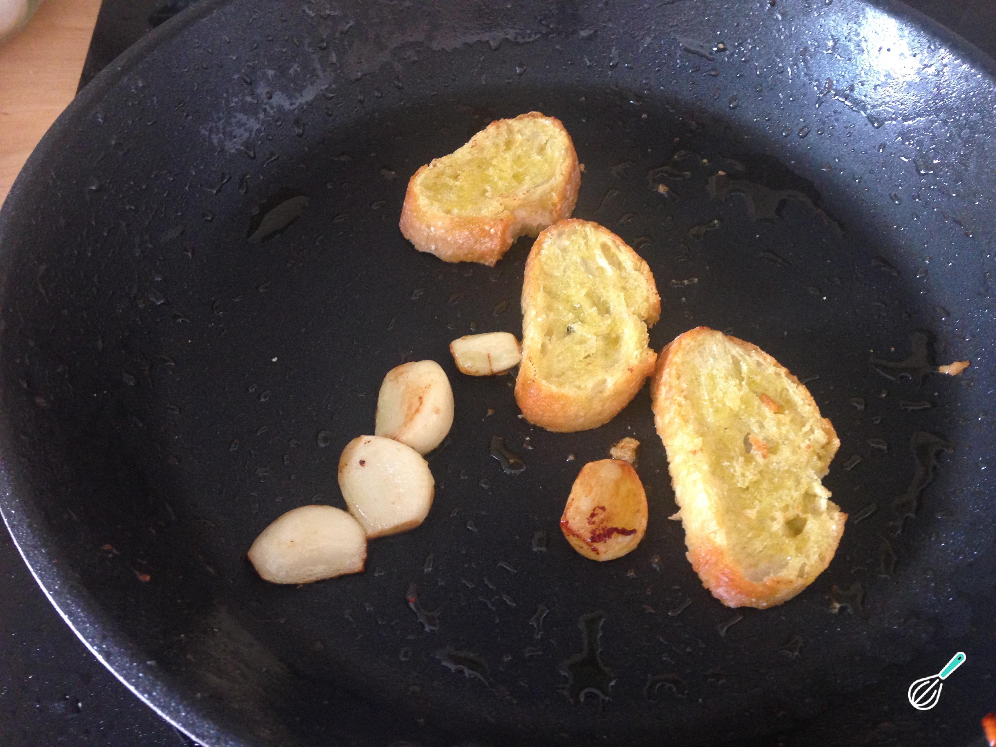 Na mesma panela, frite 3 fatias de pão sem retirar o alho. Adicione mais azeite se necessário.