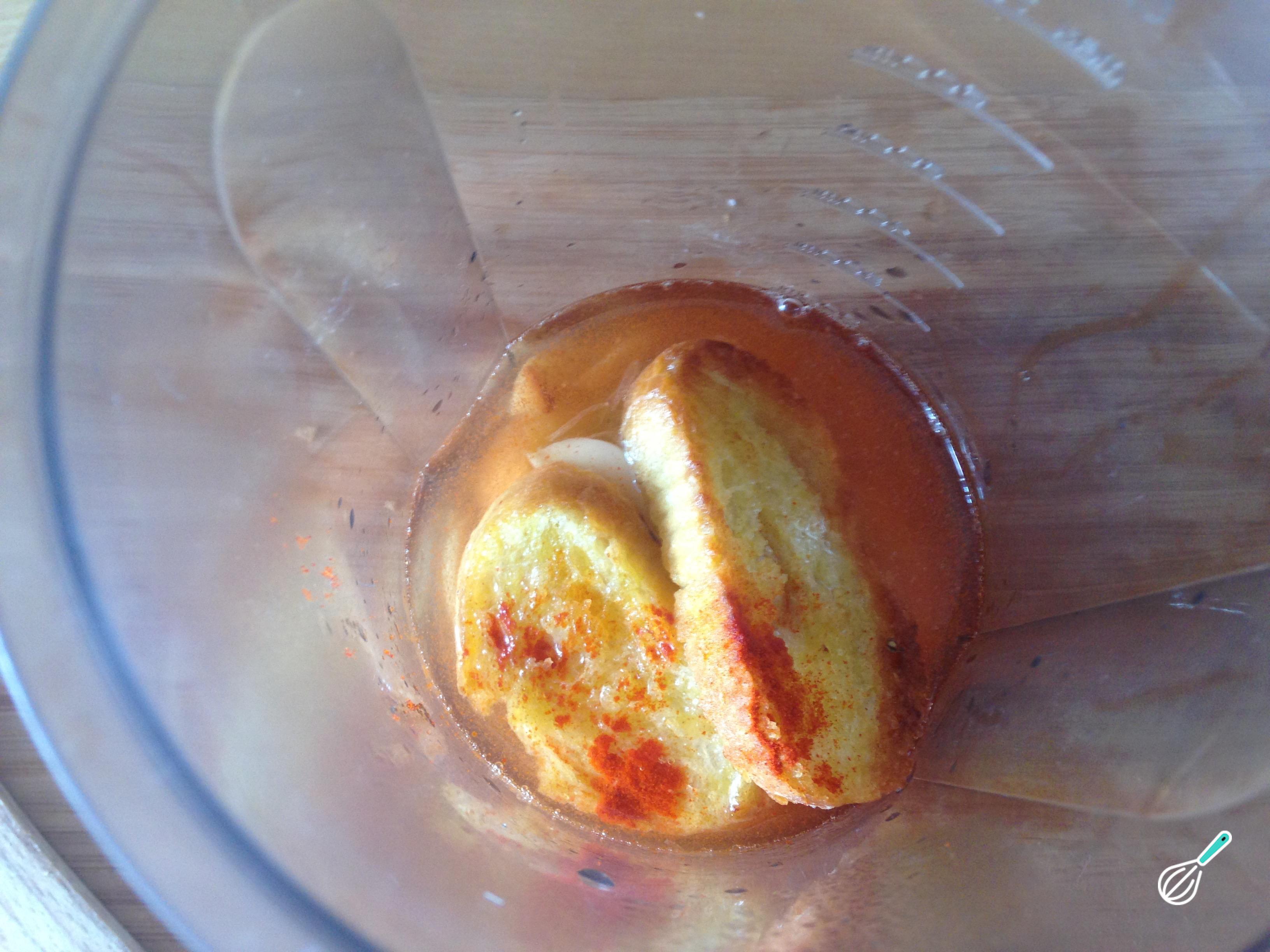 Para continuar com esta receita de coelho ao molho simples, bata o pão frito no liquidificador com um par de dentes de alho, a pimenta do reino, uma fio de vinagre e um copo de água.