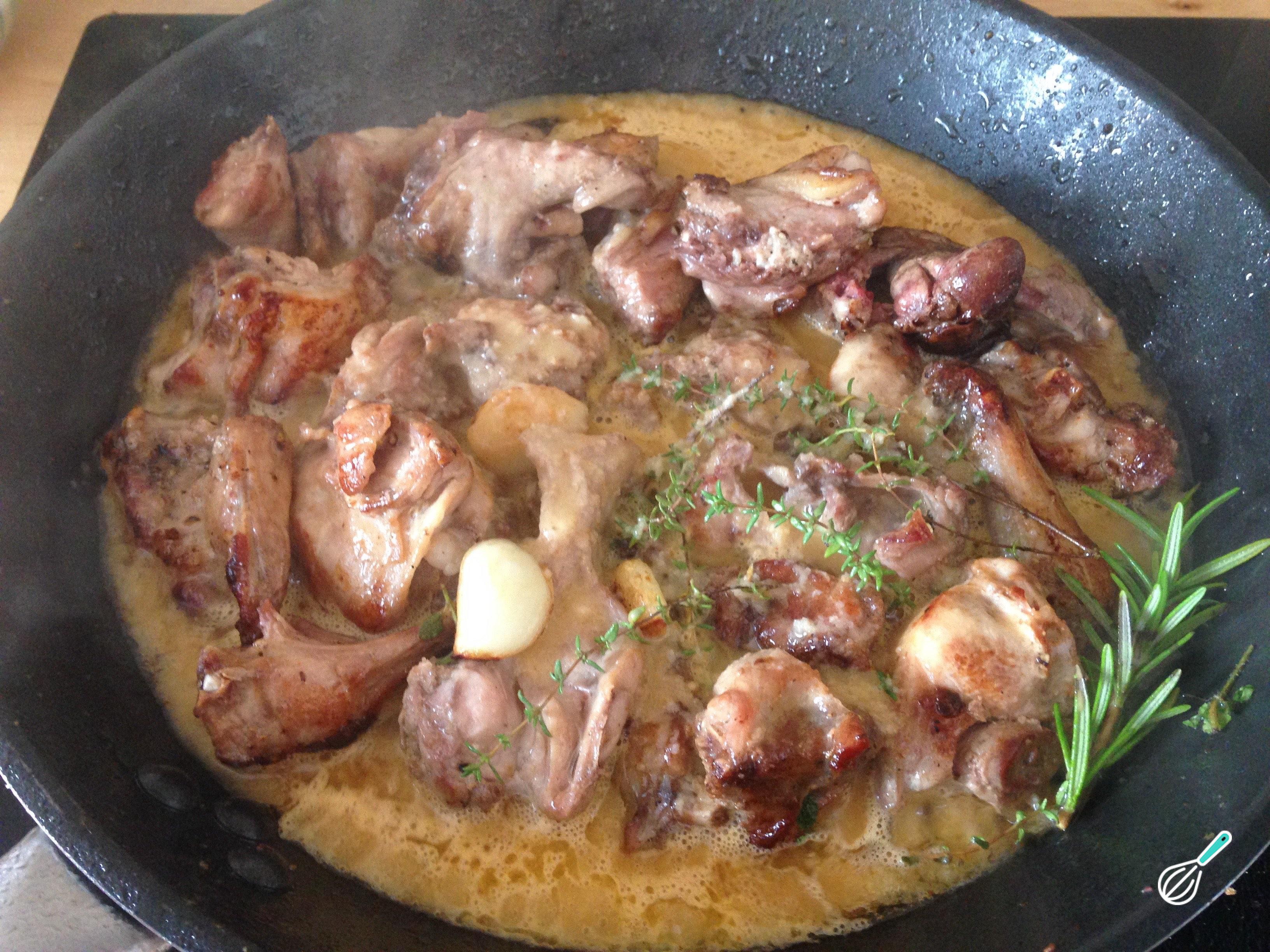 Volte a colocar o coelho na frigideira, adicione as ervas aromáticas e o molho batido. Deixe cozinhar 15 minutos em fogo médio.