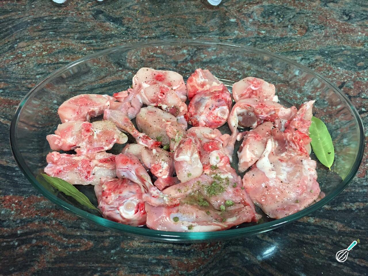 Em uma assadeira coloque o coelho com o vinho branco, louro, sal, pimenta do reino e ervas. Misture bem, para espalhar os temperos pela carne.