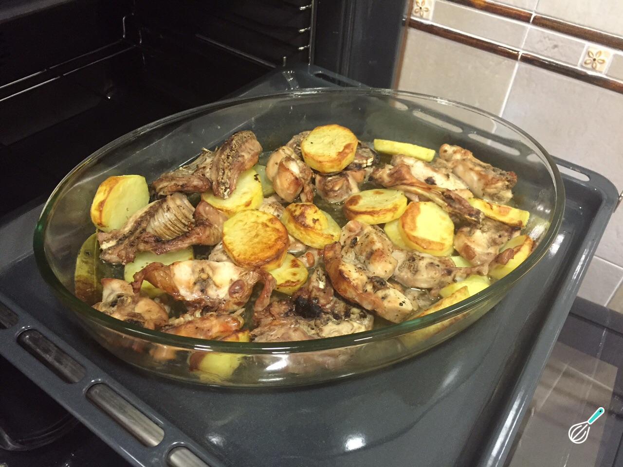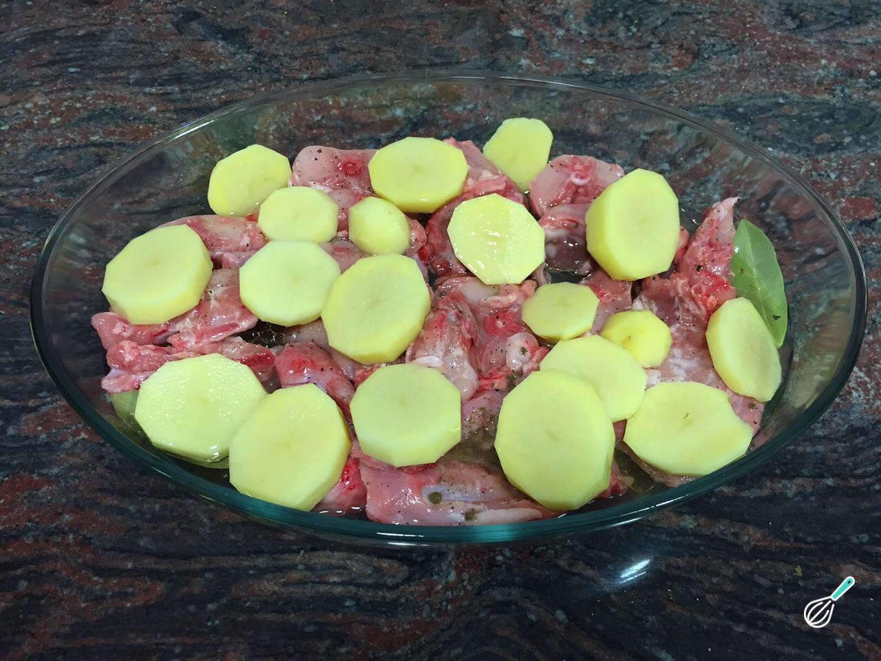 Descasque e corte as batatas, coloque-as sobre o coelho e regue com azeite. Deixe marinar por 1 hora antes de levar ao forno.