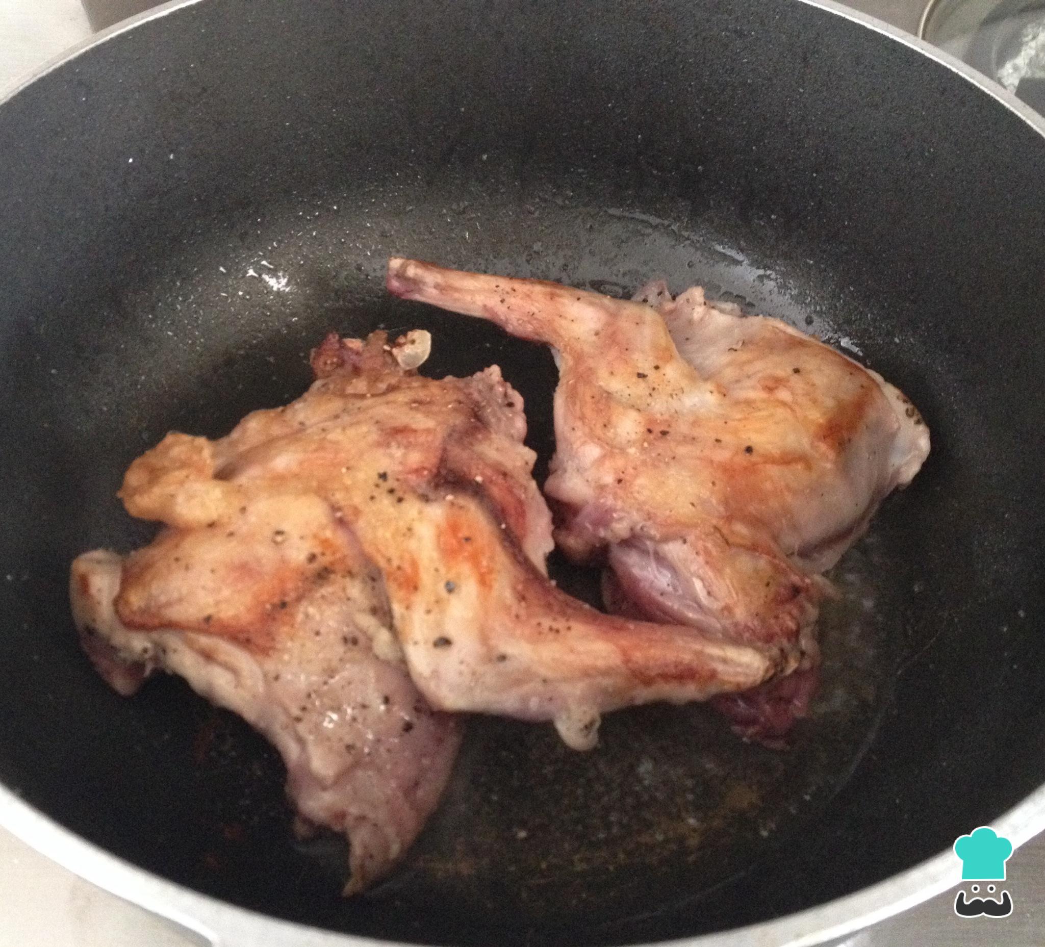 Tempere o coelho com sal e pimenta e leve a dourar de todos os lados em uma frigideira com o óleo. Ao cumprir com este passo, certificamo-nos que a carne no interior se mantém tenra e suculenta.