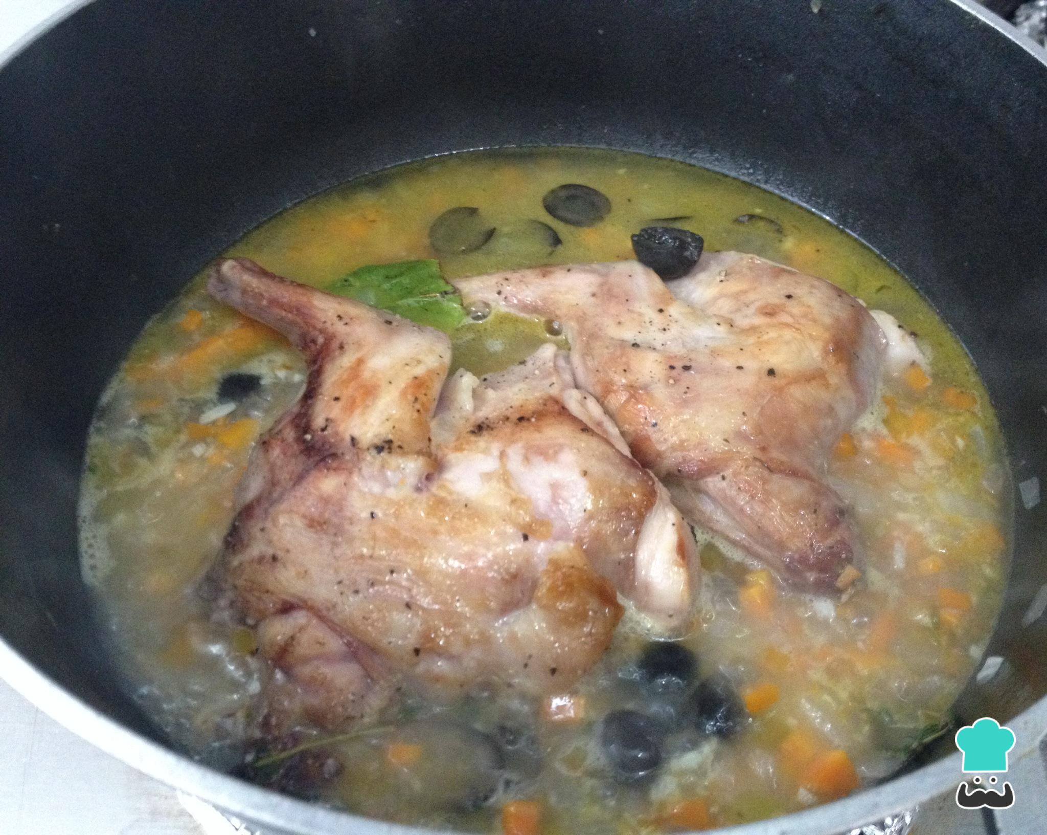 Adicione novamente o coelho e junte a sidra ou vinho e as azeitonas. Deixe evaporar o álcool, cozinhando por alguns minutos.