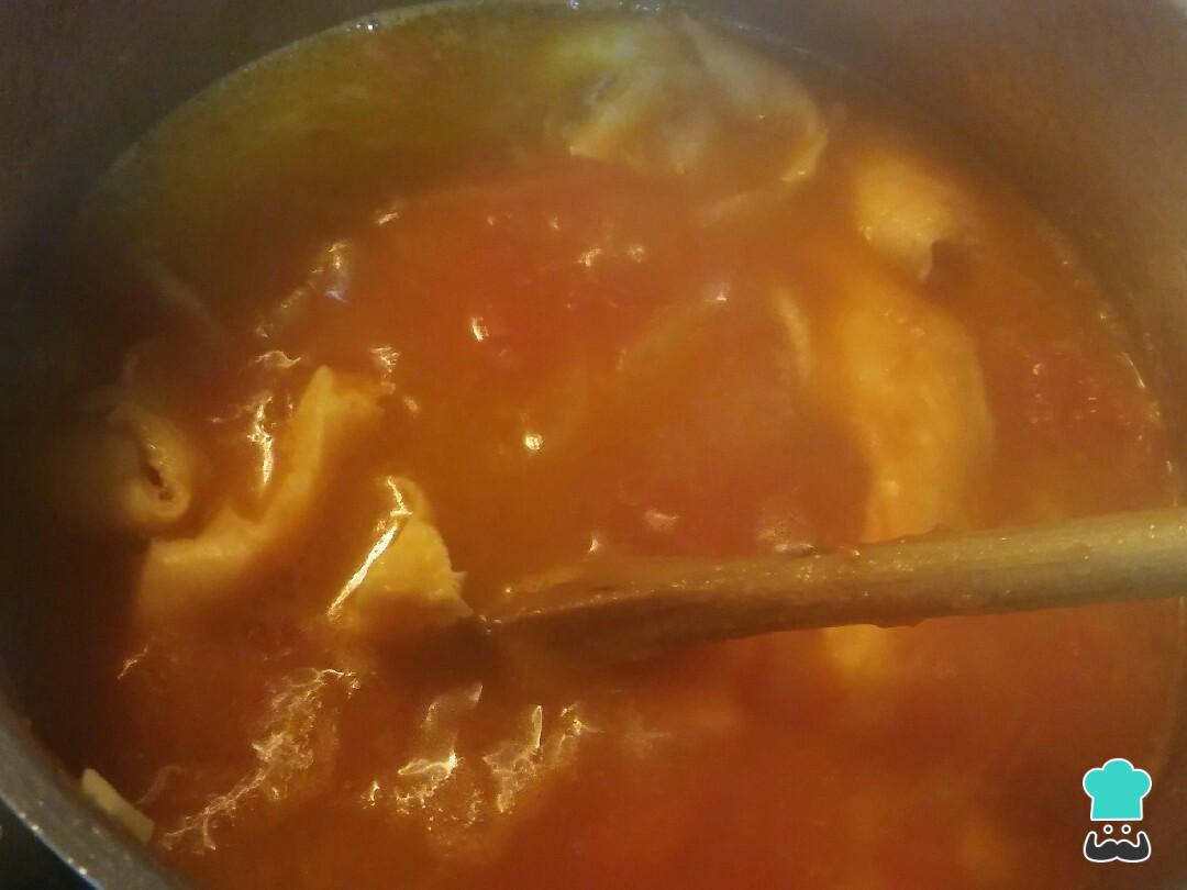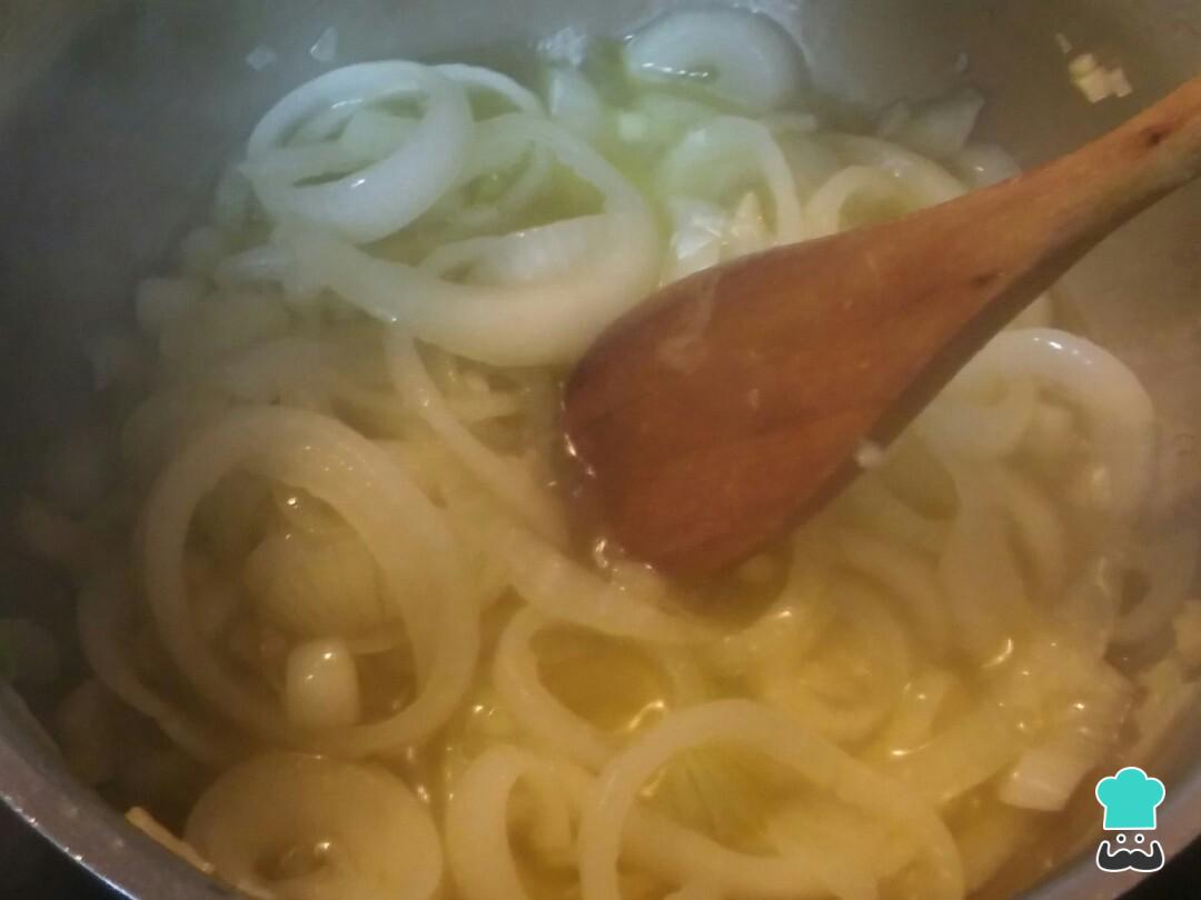 Num tacho coloque o azeite e o alho e deixe ferver um pouco. De seguida junte a cebola e refogue até que a cebola fique macia.