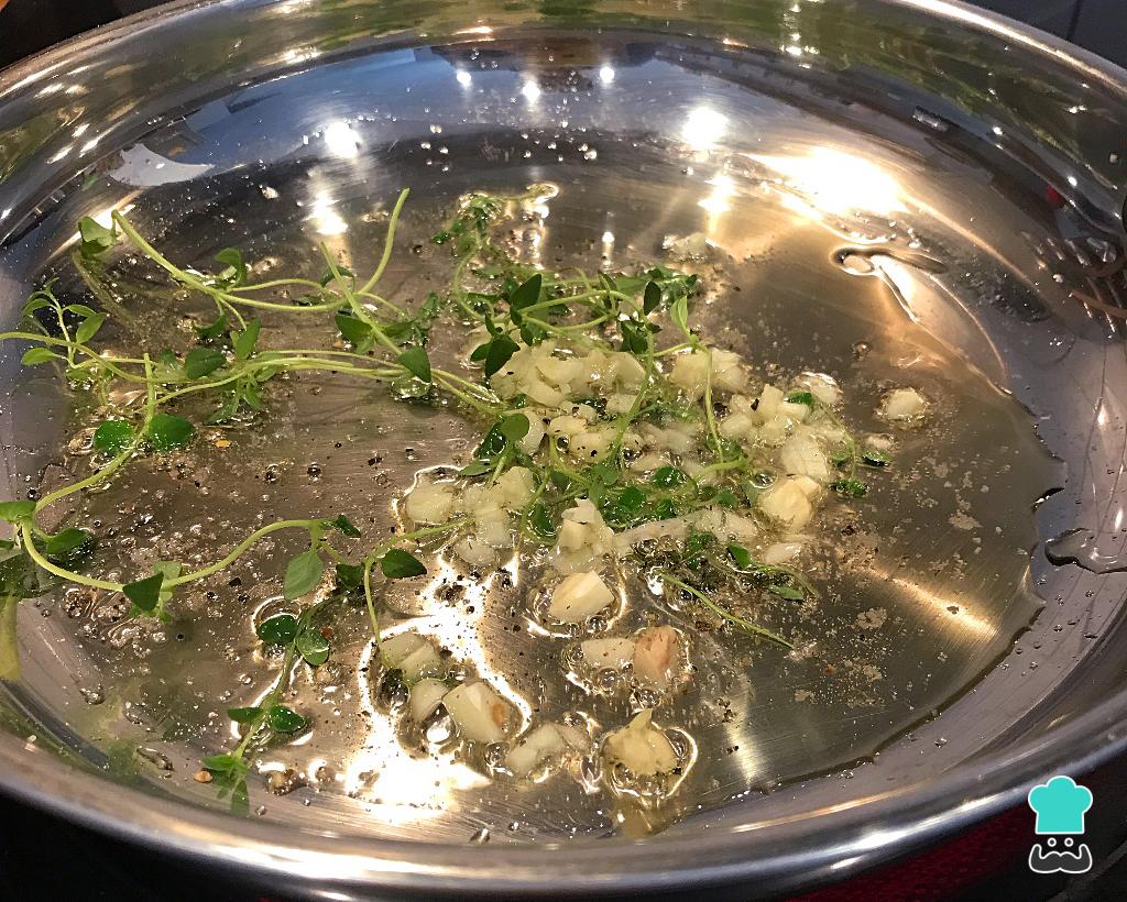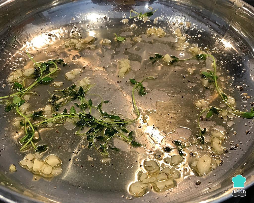 Comece aquecendo uma frigideira. Coloque a manteiga, o tomilho e o alho picadinho e tempere com sal e pimenta.