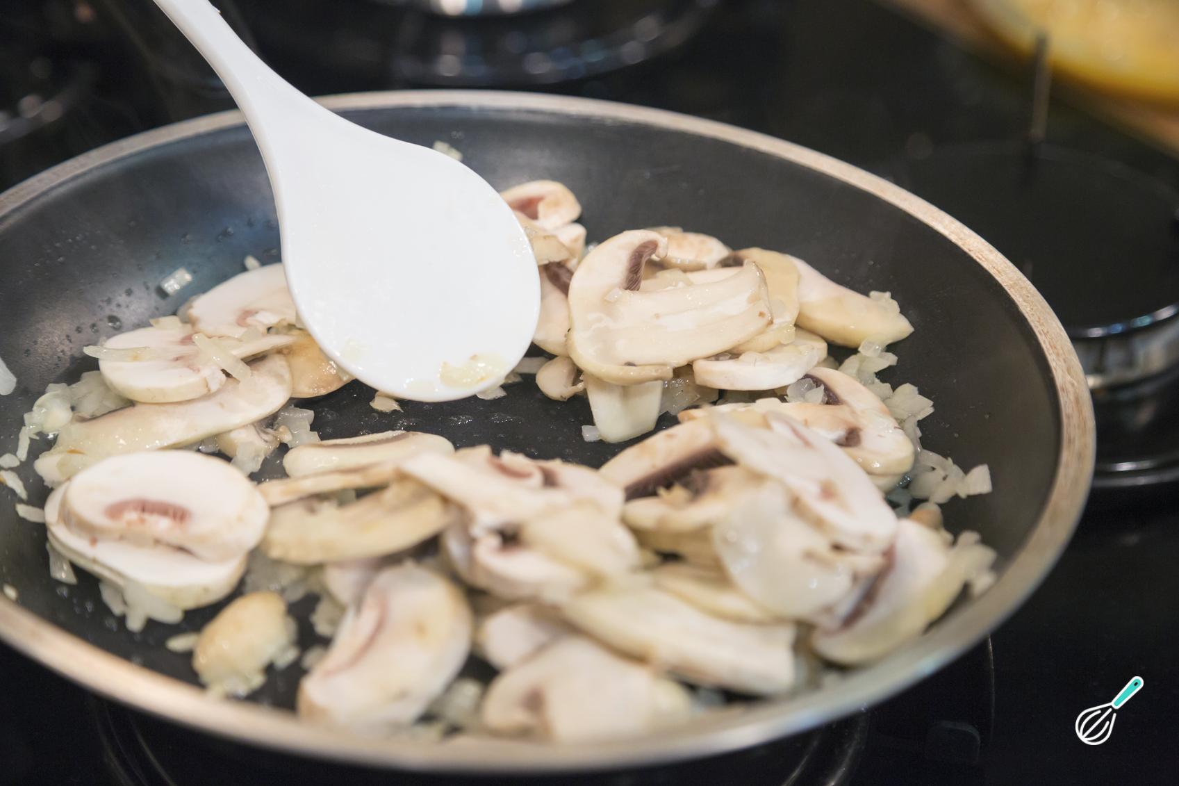 Refogue a cebola previamente cortada em tirinhas. Quando ficar transparente, junte os cogumelos laminados e deixe refogar por 3 minutos.