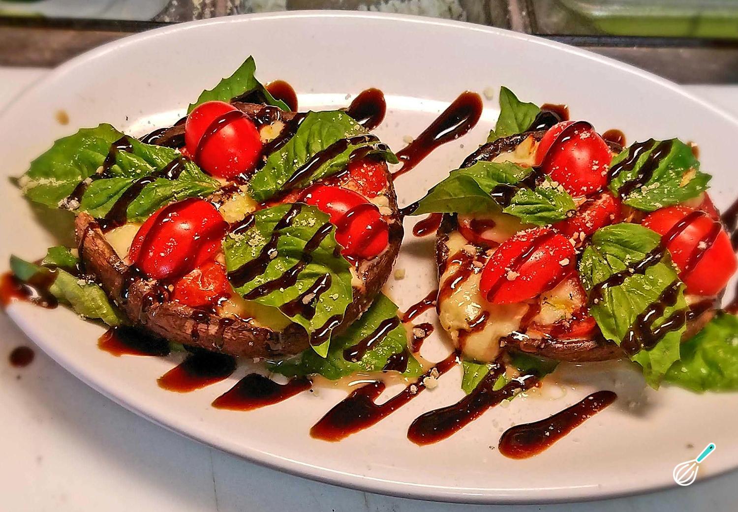 Decore os cogumelos Portobello recheados no forno com folhas de manjericão, pedaços de tomate cereja e vinagre balsâmico a gosto.
