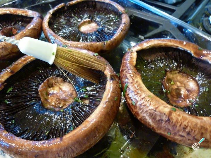 Para começar a preparar os seus cogumelos Portobello recheados no forno, comece por cobrir os cogumelos com a manteiga de alho. Leve-os a assar em forno a 185 º C por 5-8 minutos.