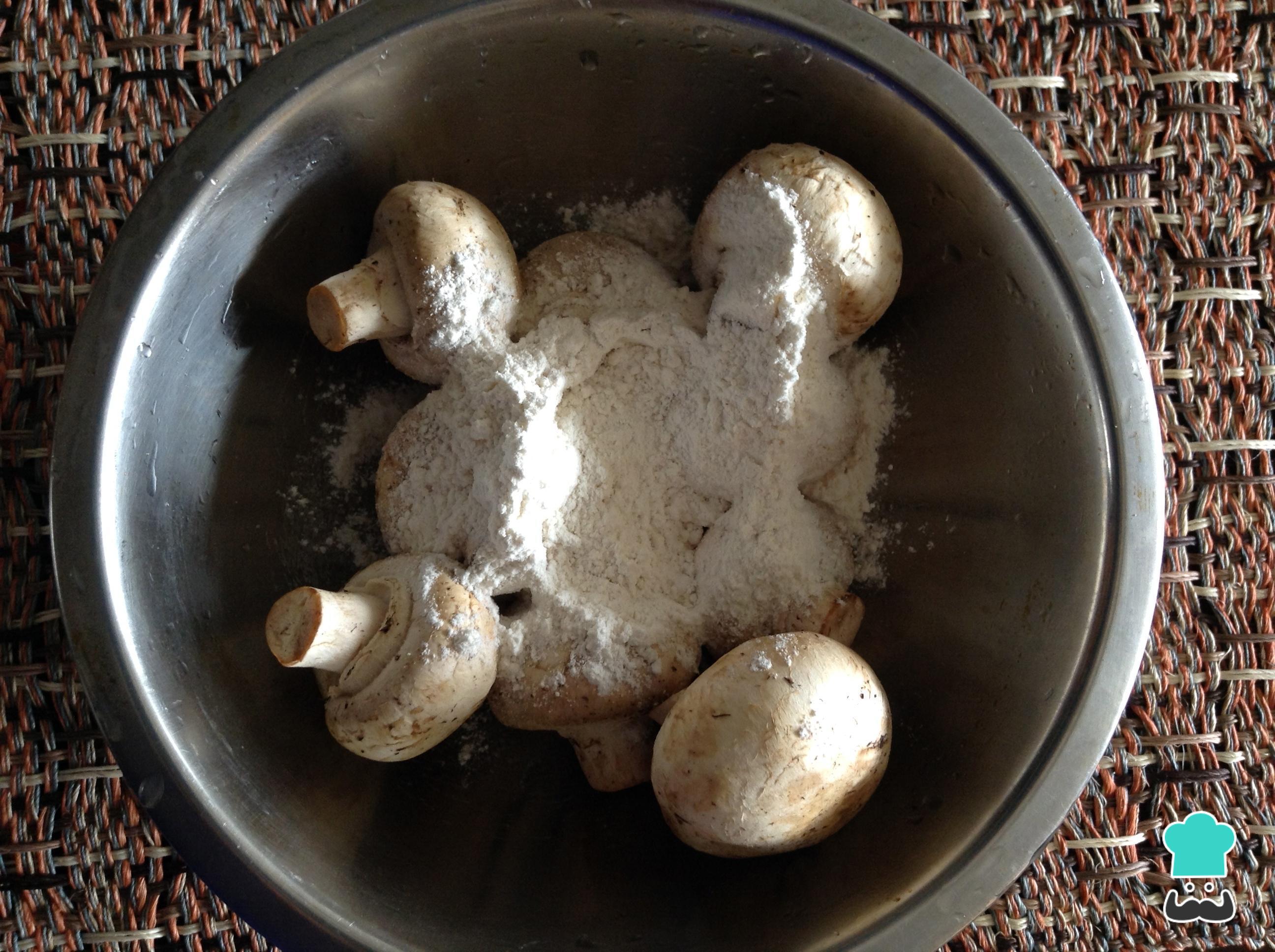Em uma tigela, adicione os cogumelos e farinha de trigo e misture. Este é um truque para ajudar a limpar a sujeira dos cogumelos.