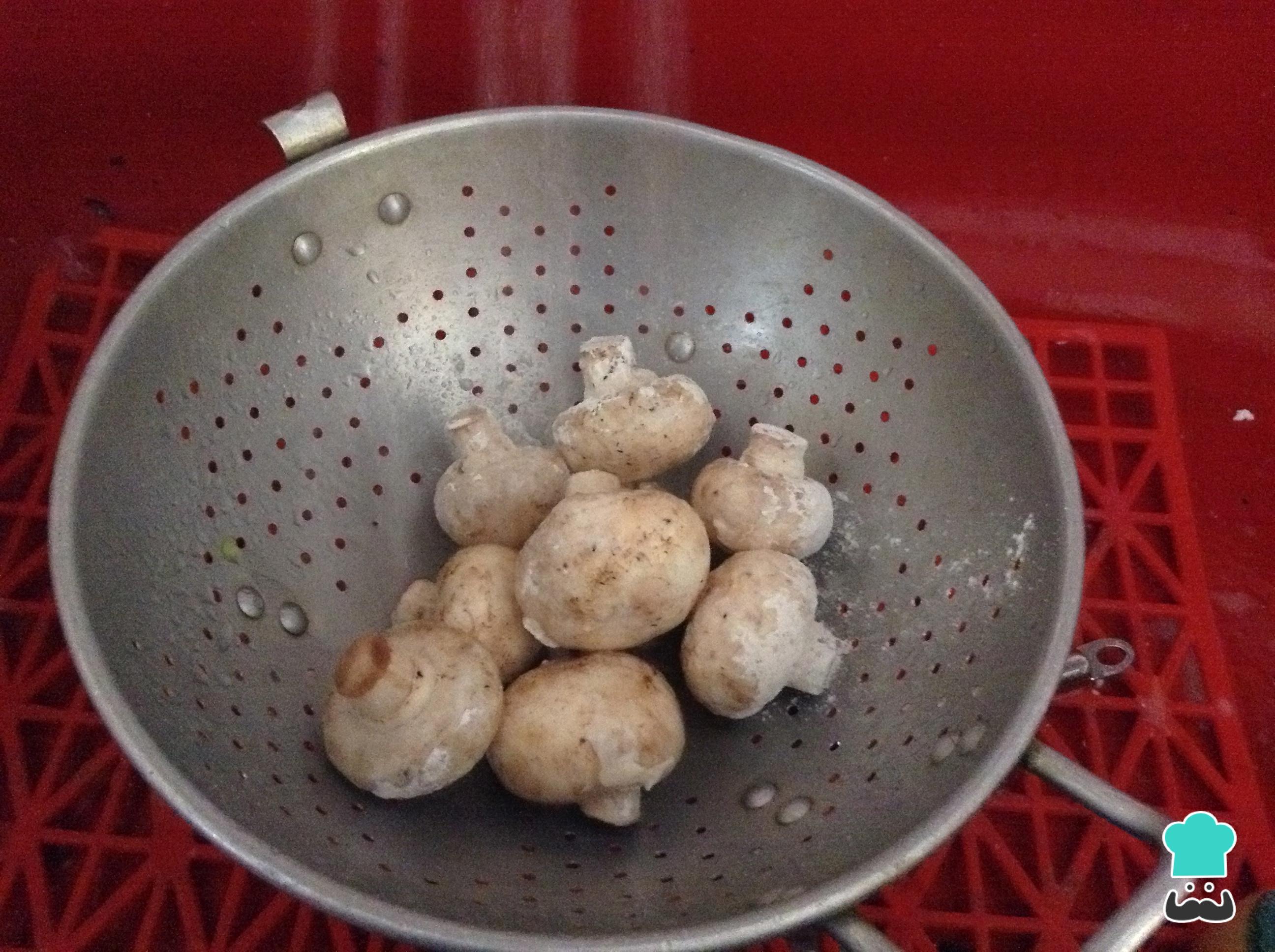 De seguida lave os cogumelos removendo toda a farinha. Escorra bem.