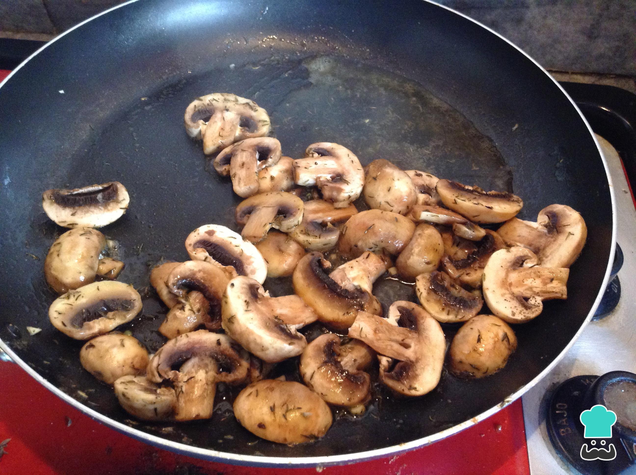 Adicione os cogumelos e tempere com sal e pimenta a gosto. Cozinhe durante cerca de 5 minutos, aproximadamente.