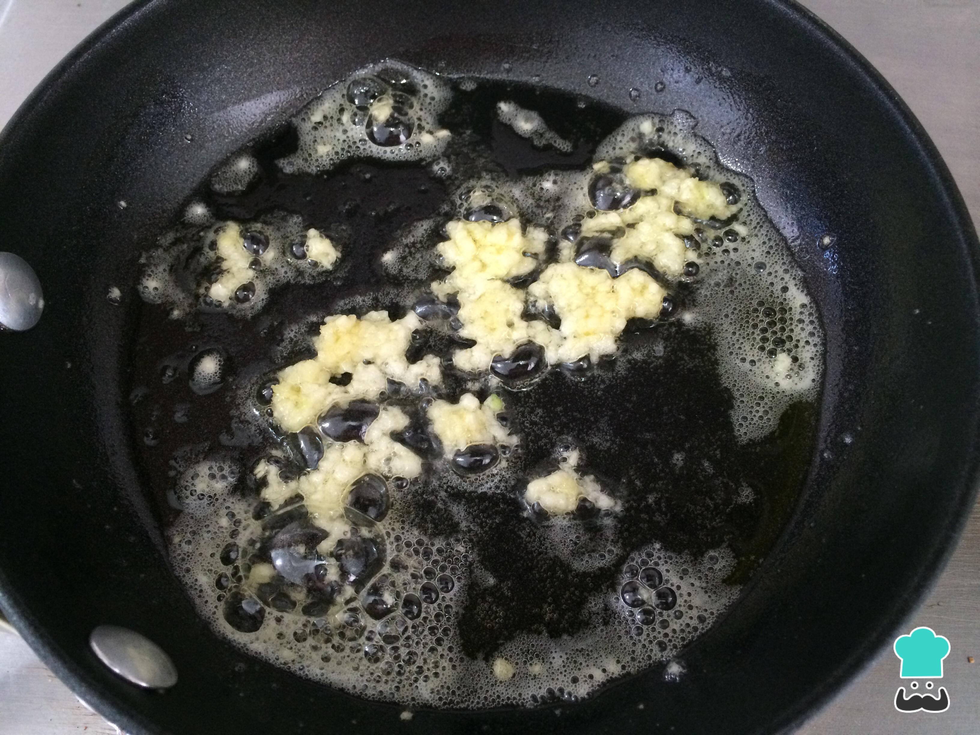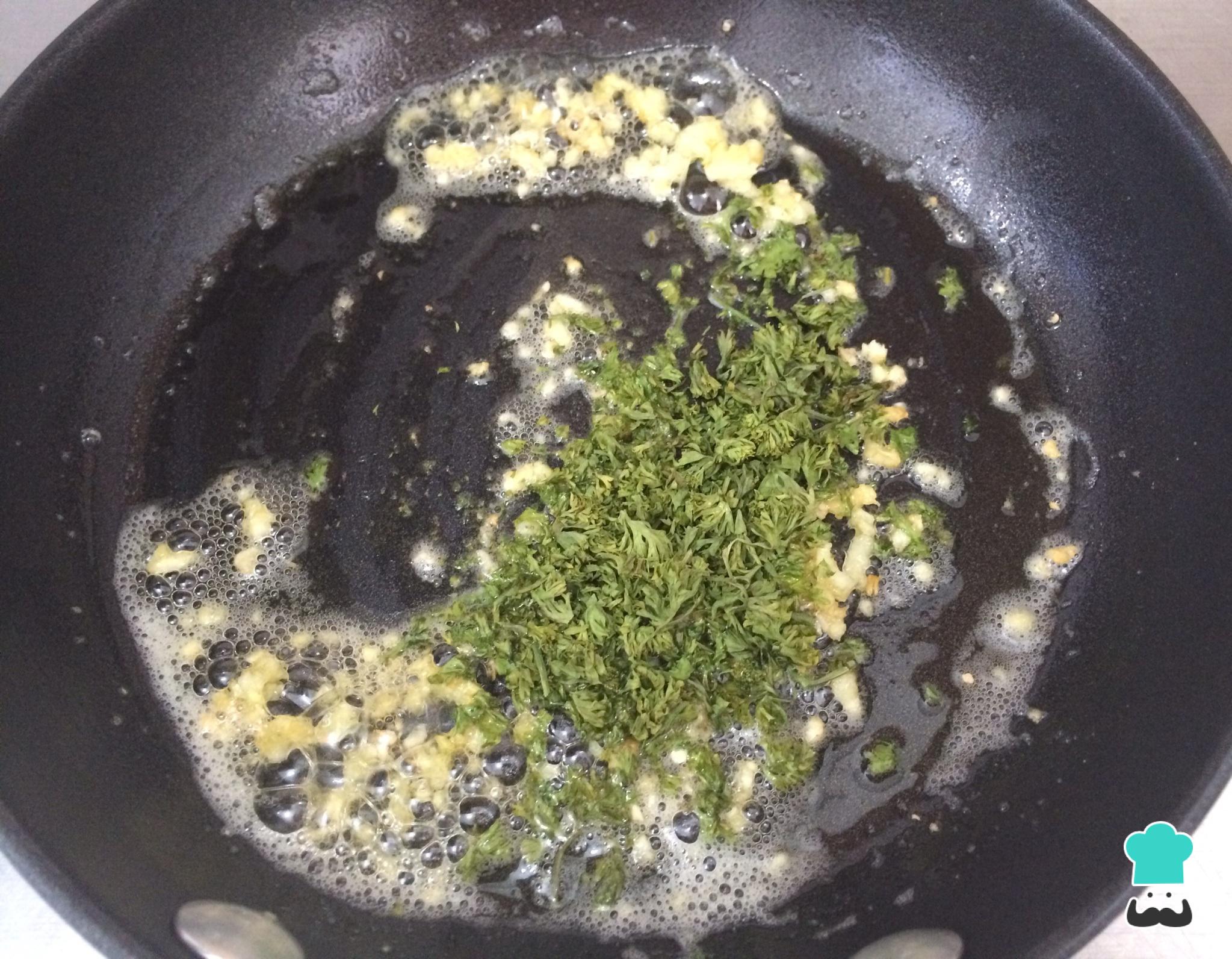Em uma frigideira derreta a manteiga em fogo baixo, acrescente o alho finamente picado e cozinhe durante 2 minutos mexendo constantemente para evitar que se queime.