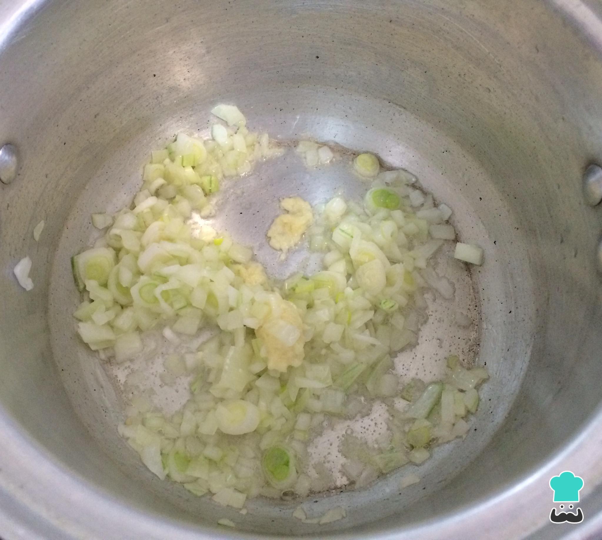 Em uma panela com um pouco de óleo, cozinhe a cebola, a cebolinha e o alho picados finamente, até que fiquem macios.