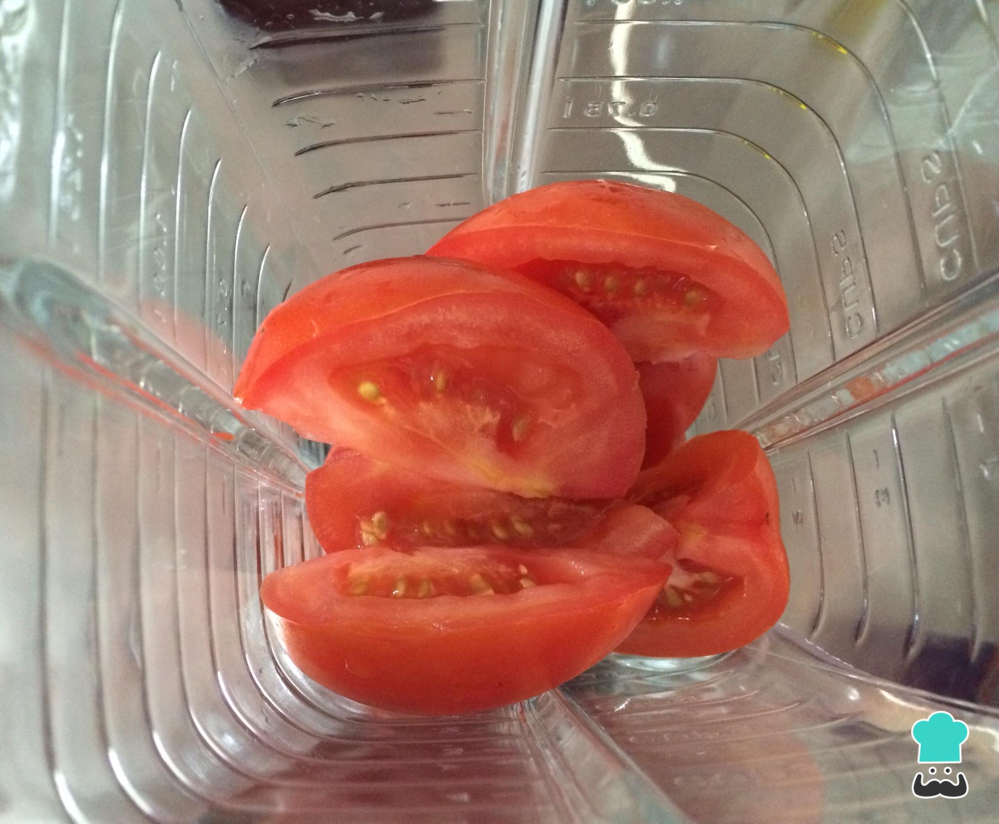 Lave os tomates, retire os talos e corte em quartos. Coloque no copo do liquidificador e bata até obter uma mistura homogênea.