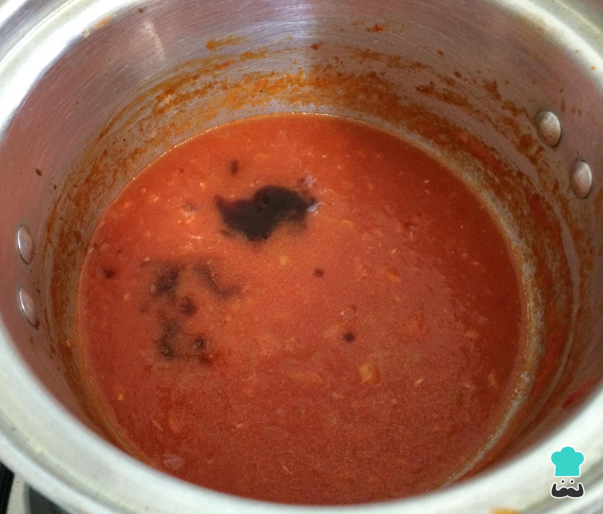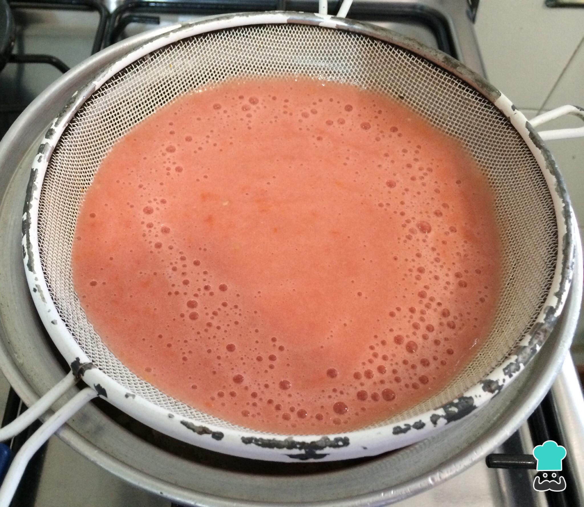 Coe os tomates batidos, de forma a eliminar as sementes, e adicione ao refogado anterior. Cozinhe em fogo baixo por 20 minutos.