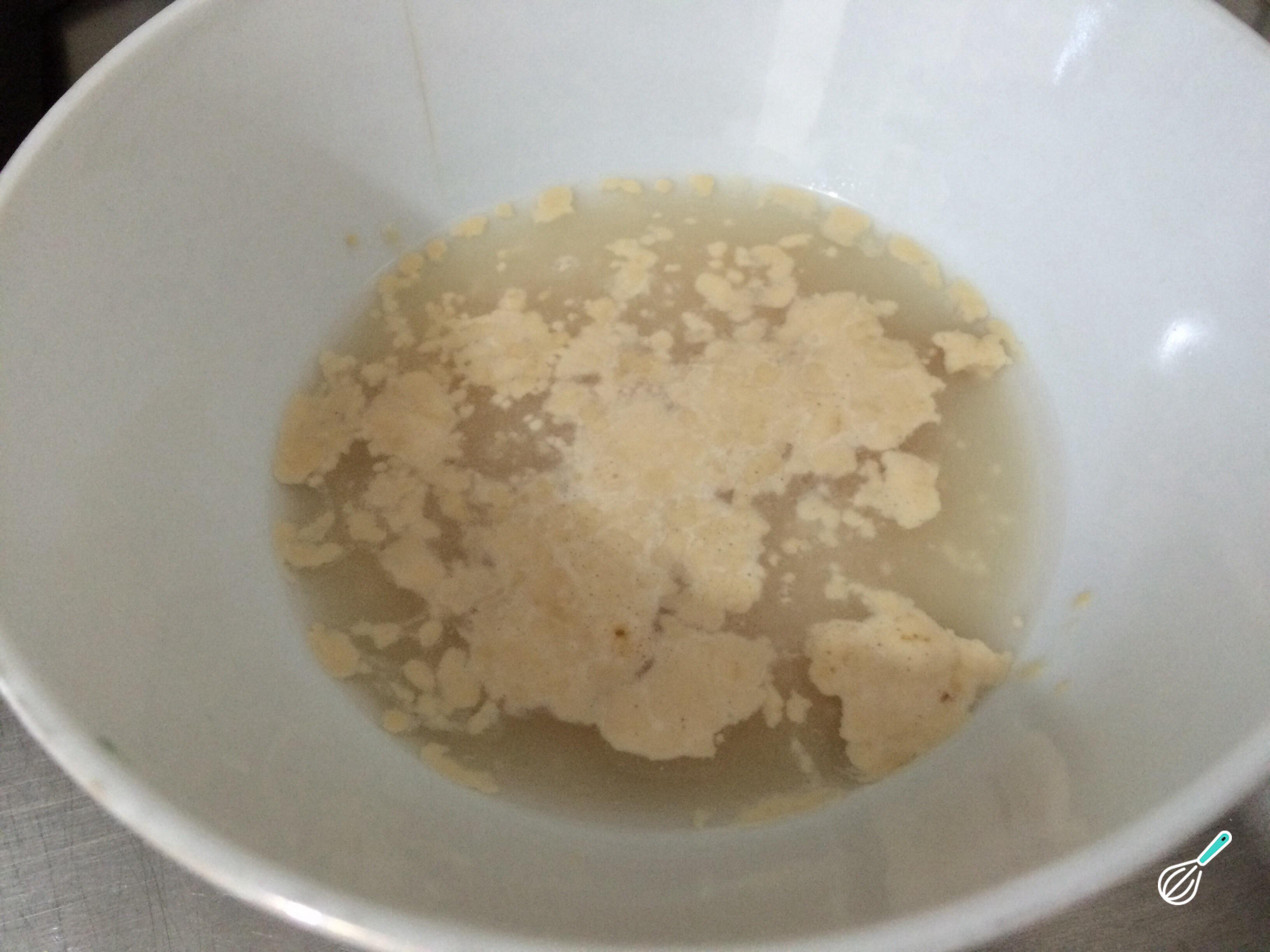 Inicie o preparo da receita de colomba pascal dissolvendo o fermento na água junto com o açúcar e o sal, de preferência em uma vasilha grande o suficiente para acomodar toda a massa.