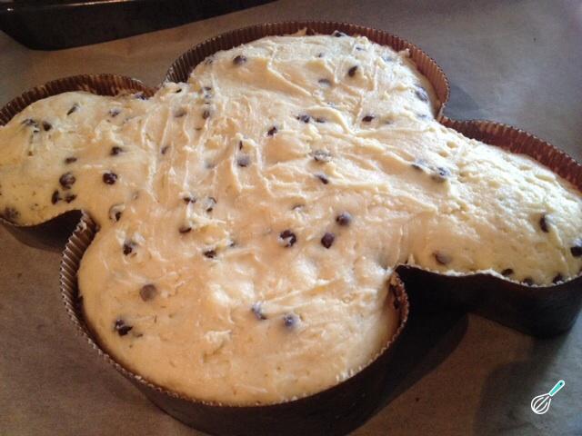 Abra a massa e coloque ao centro as frutas ou gotas de chocolate. Feche e sove mais um pouco, para espalhar bem esses ingredientes. Modele a massa desta colomba pascal em forma de bola ou coloque numa forma tradicional de colomba pascal. Cubra com um pano e deixe crescer em um local ameno por 1 hora.