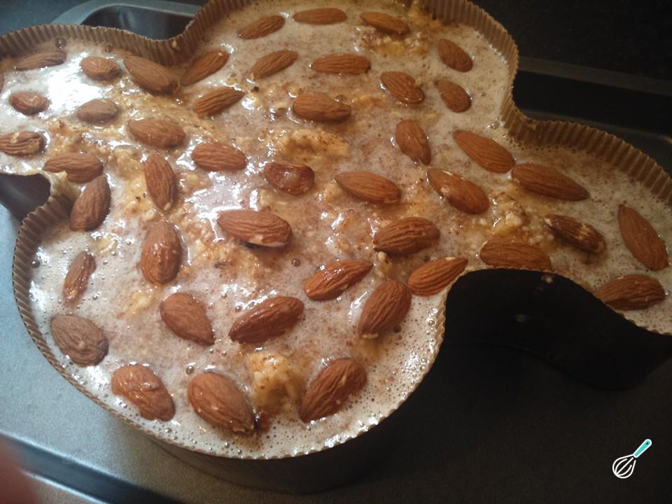 Enquanto isso, prepare a cobertura desta receita de colomba pascal: bata as claras de ovo até espumar, acrescente a farinha e o açúcar e misture. Espalhe essa mistura sobre o bolinho já crescido e decore com as amêndoas ou cajus.