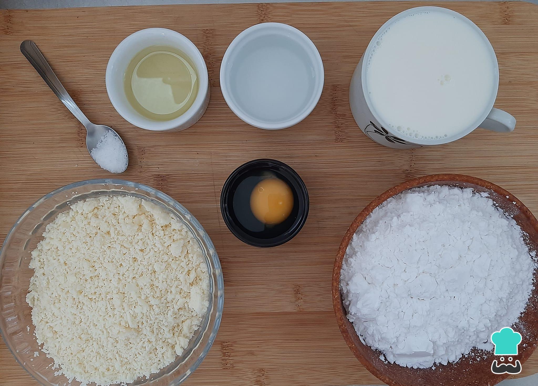 Separe os ingredientes necessários para preparar os pães de queijo que serão congelados.