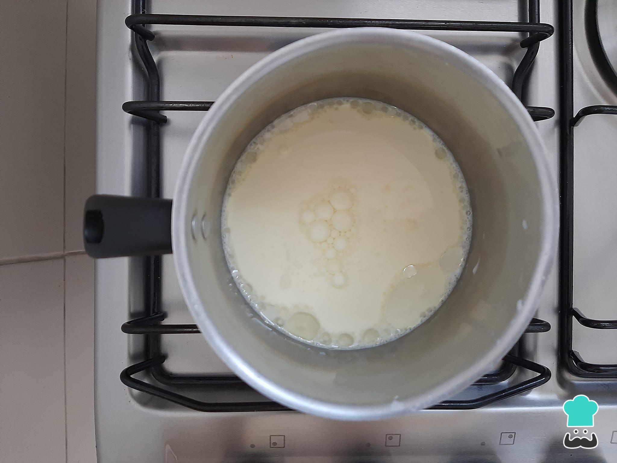 Numa panela, leve ao fogo médio o leite, o óleo e a água, desligando assim que levantar fervura.