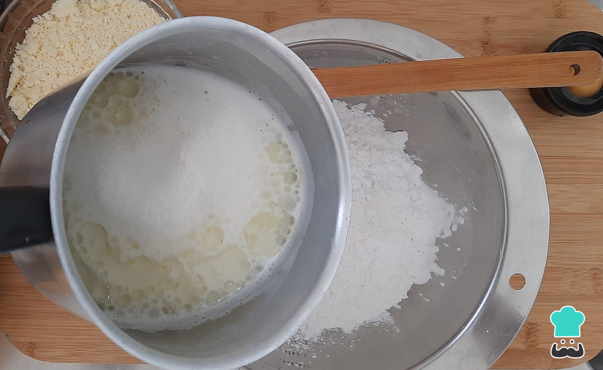 Com o líquido quente, despeje-o sobre o polvilho doce e o sal para que seja escaldado neste momento.