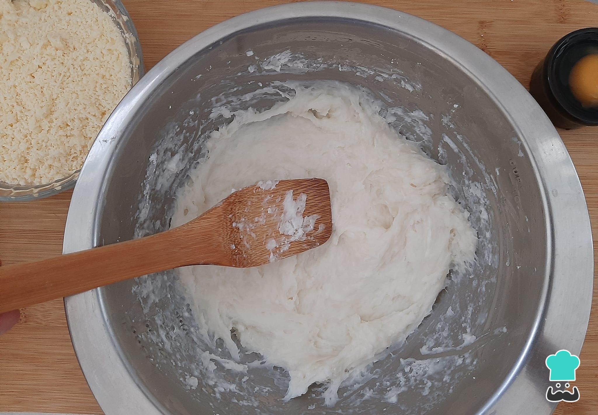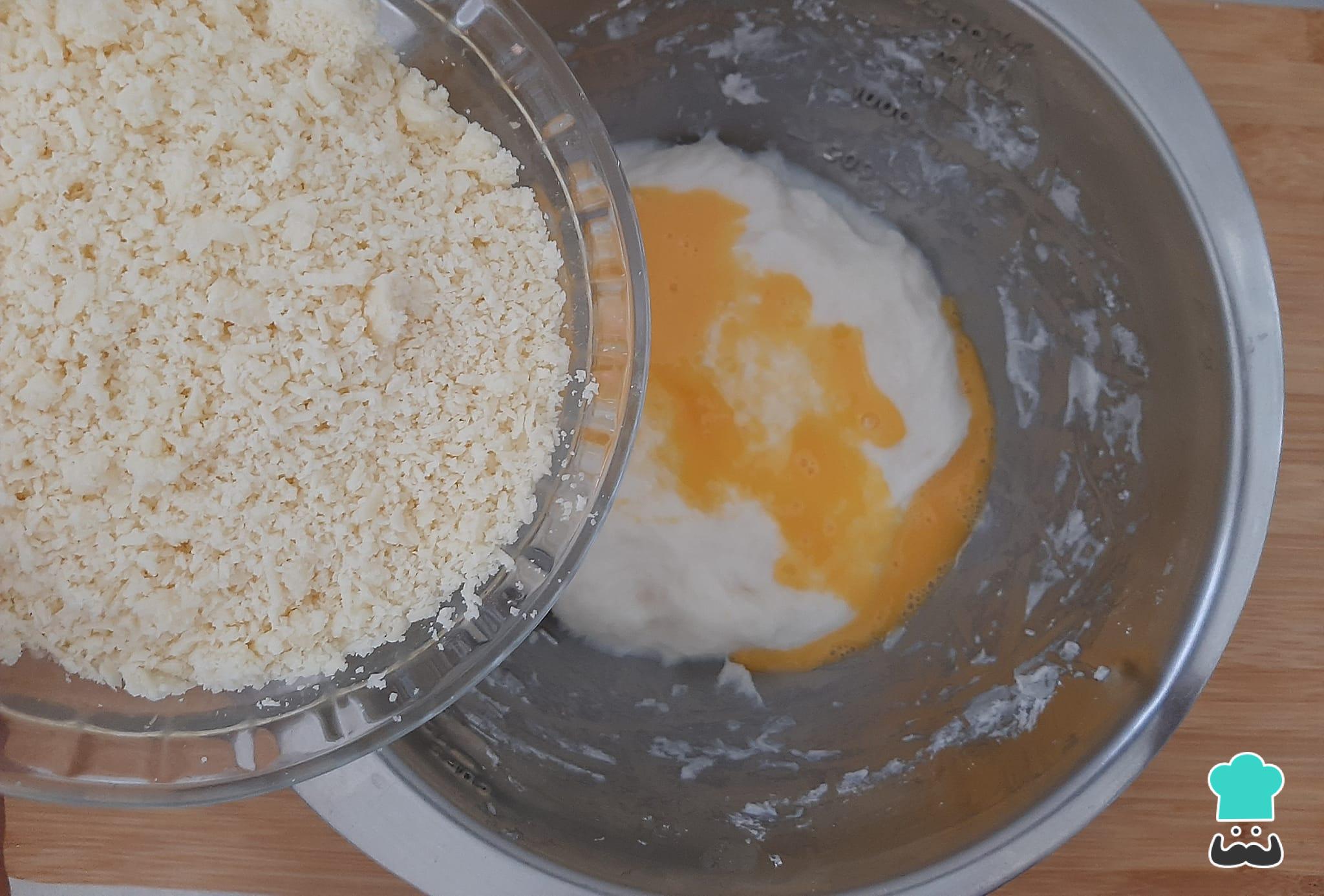 Com o polvilho morno, adicione o ovo e o queijo ralado e comece a trabalhar a massa, para que tudo fique misturado.