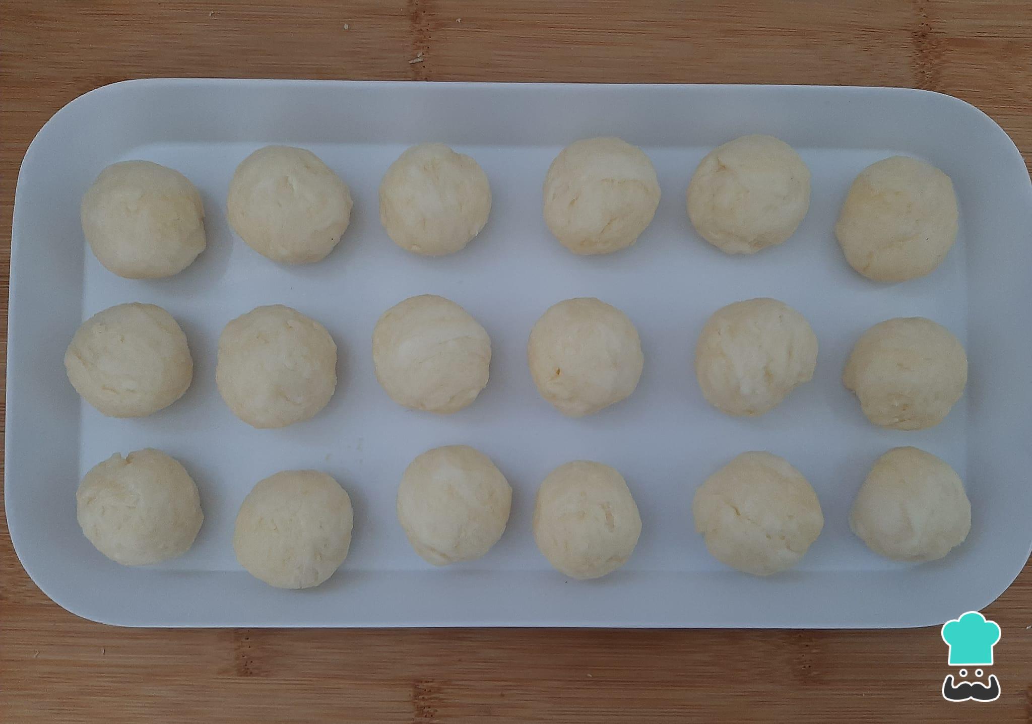 Dica: Dica: se quiser, utilize uma colher de medida para pegar as porções em tamanhos iguais. Caso a massa esteja muito grudenta, umedeça as mãos com um pouco de óleo (sem exagero) para facilitar o processo.