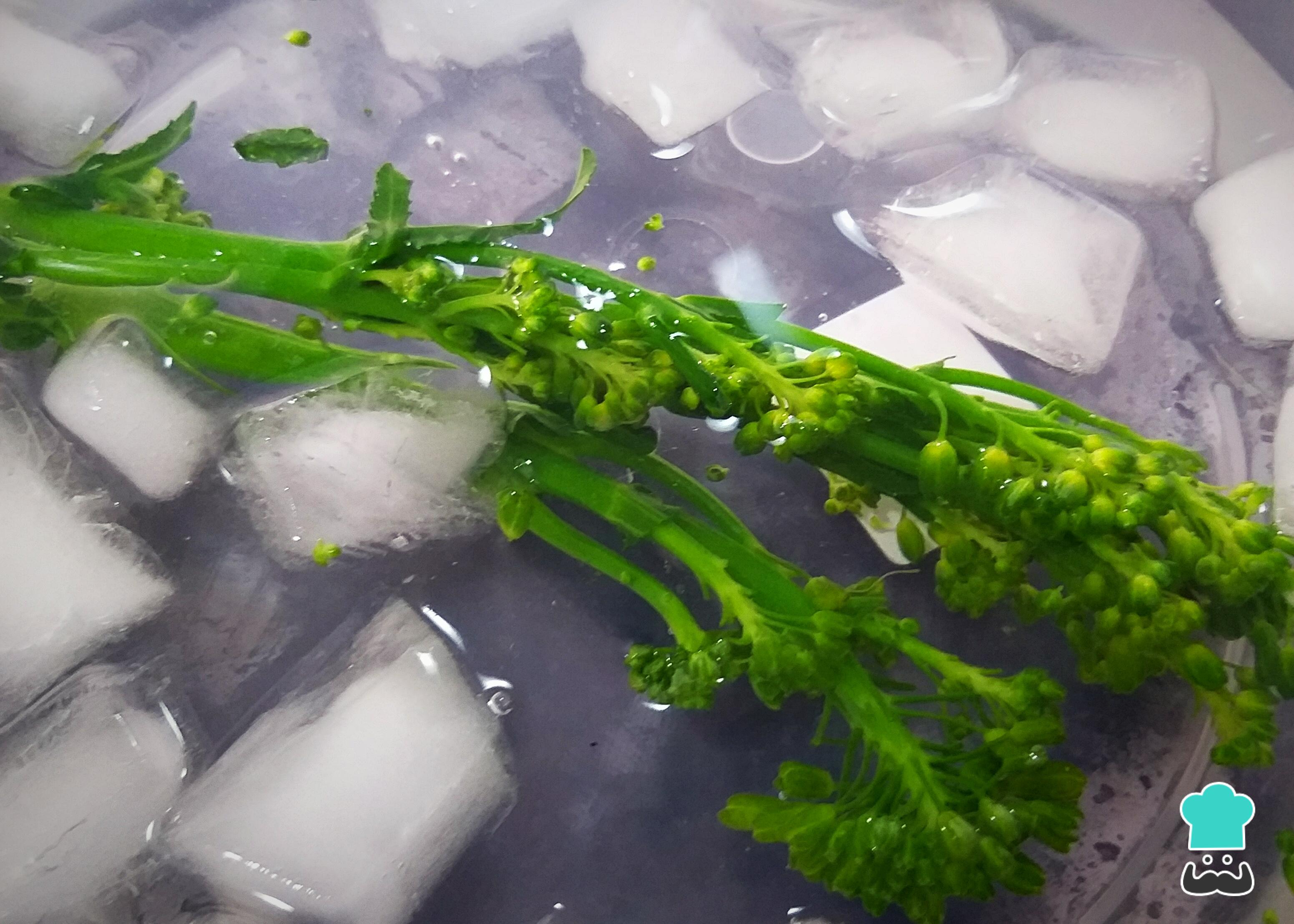Após esse tempo retire o brócolis do fogo e mergulhe imediatamente em uma vasilha com o restante da água e os cubos de gelo. Deixe por 1 minuto.