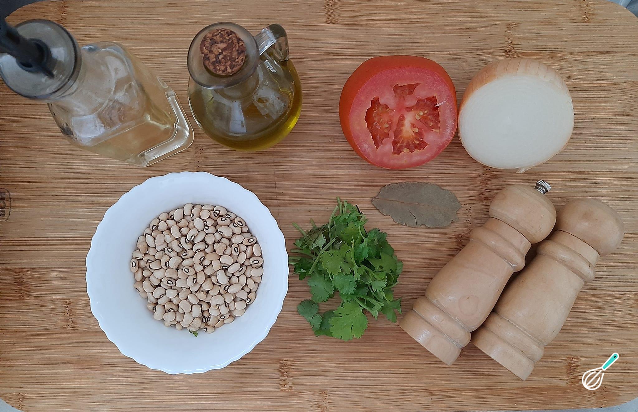 Separe os ingredientes necessários para o preparo dessa receita de salada de feijão fradinho. Se você optar por cozinhar o feijão fradinho para utilizar em outros tipos de salada, apenas separe o feijão fradinho, o sal, a pimenta-do-reino e a folha de louro.