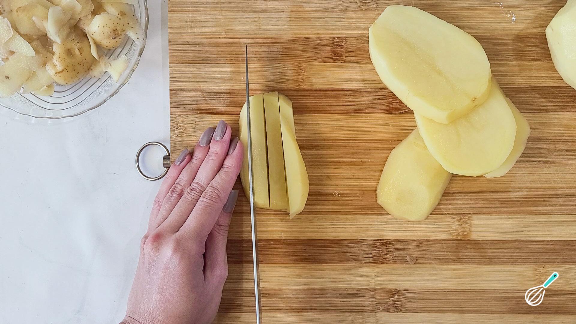 Lave bem as batatas em água corrente e retire toda a casca. Corte em fatias de 3 ou 4 mm e depois em palitos, como na foto.