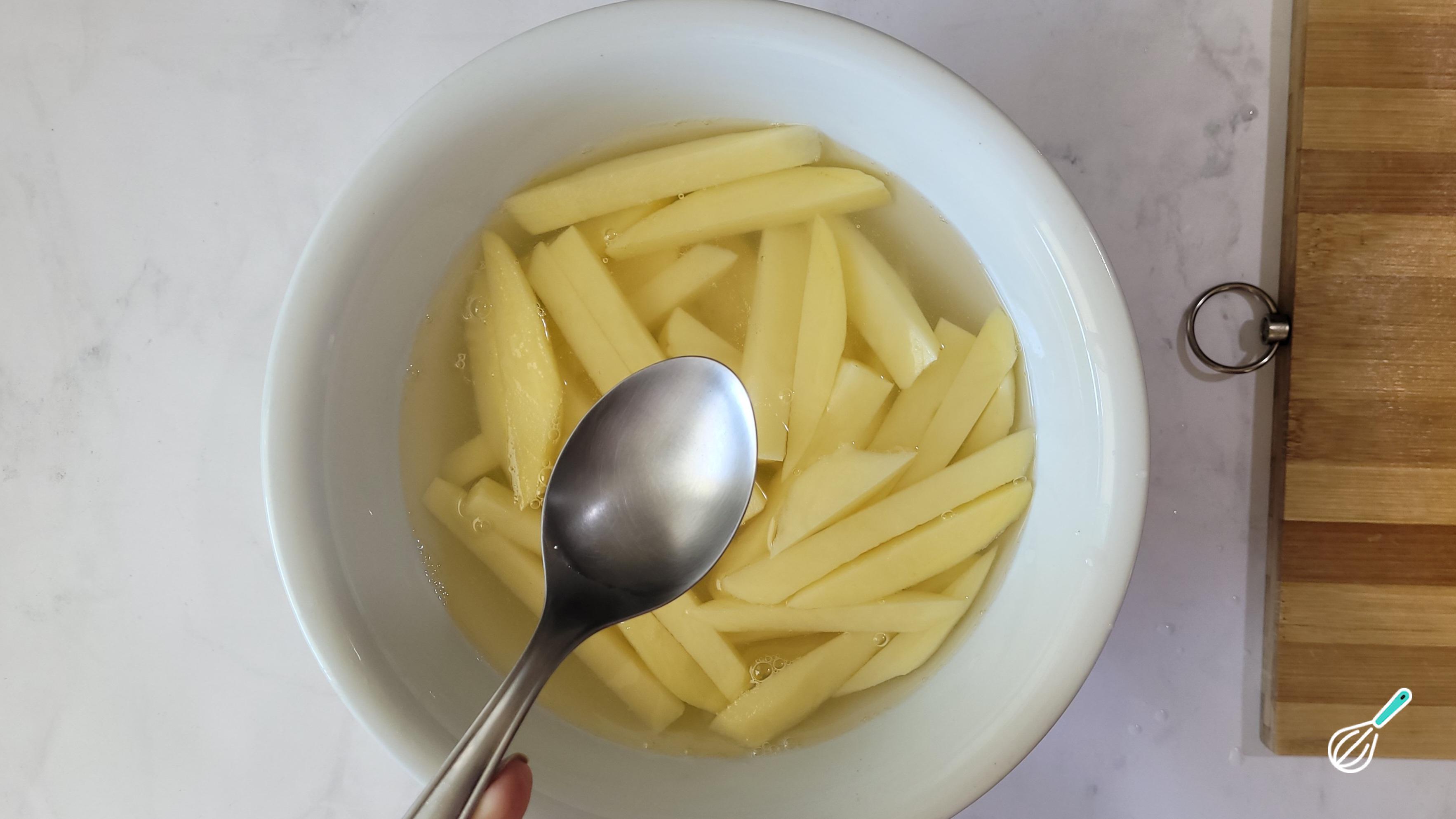 Em seguida, coloque as batatas em um recipiente com a água gelada e o vinagre. Deixe submersa por 10 minutos.