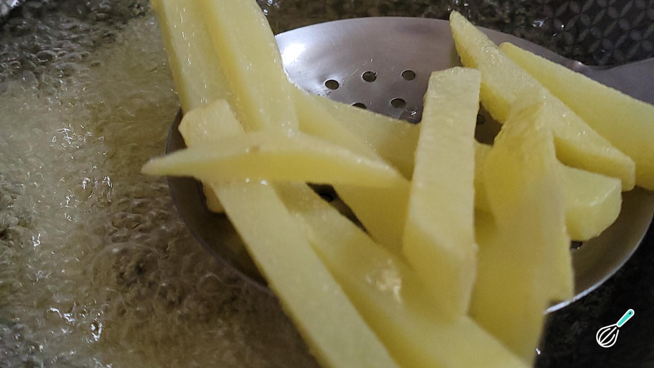 Enquanto isso, ligue o óleo em fogo médio e deixe esquentar. Quando estiver bem quente, faça a pré fritura. Coloque as batatas e deixe por 20 segundos. Retire e deixe escorrer em um recipiente com papel-toalha enquanto repete o processo com todas.