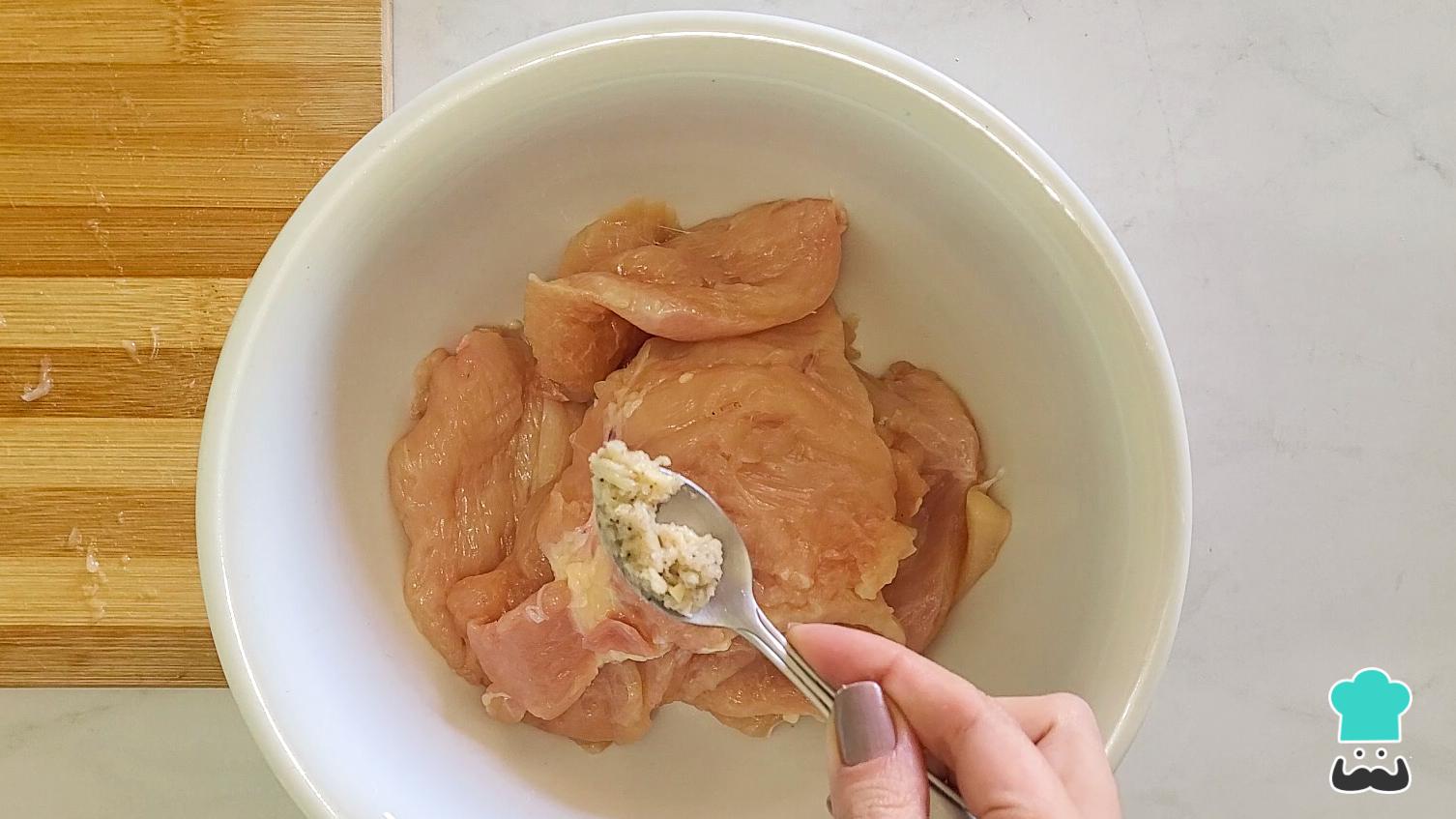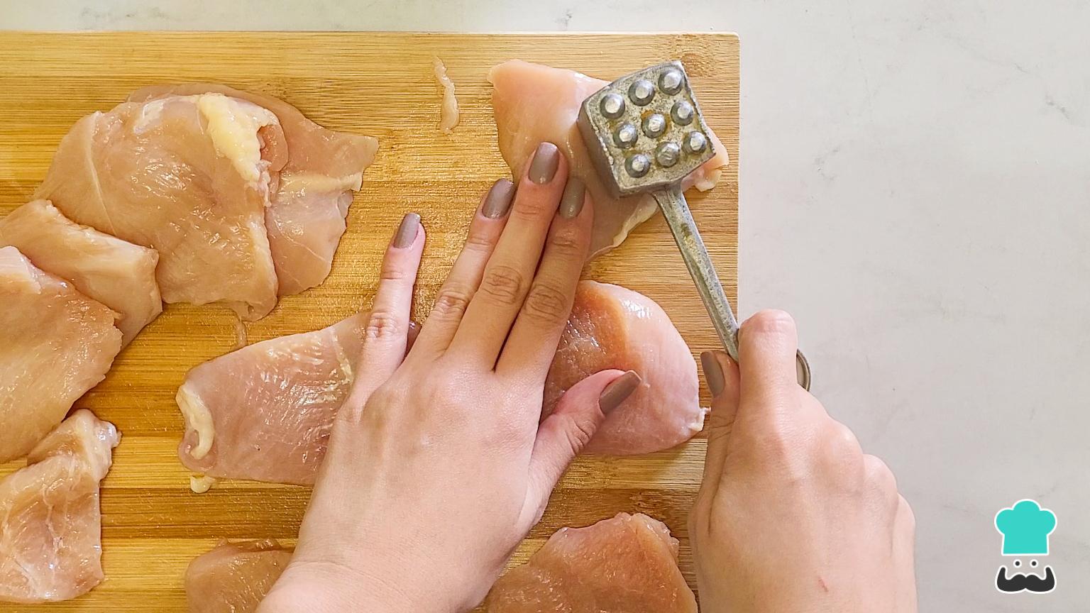 Corte o filé de peito de frango em pedaços menores e mais finos (aproximadamente 5 a 6cm). Utilize um batedor para bater no frango e assim, amaciar a carne. Reserve.
