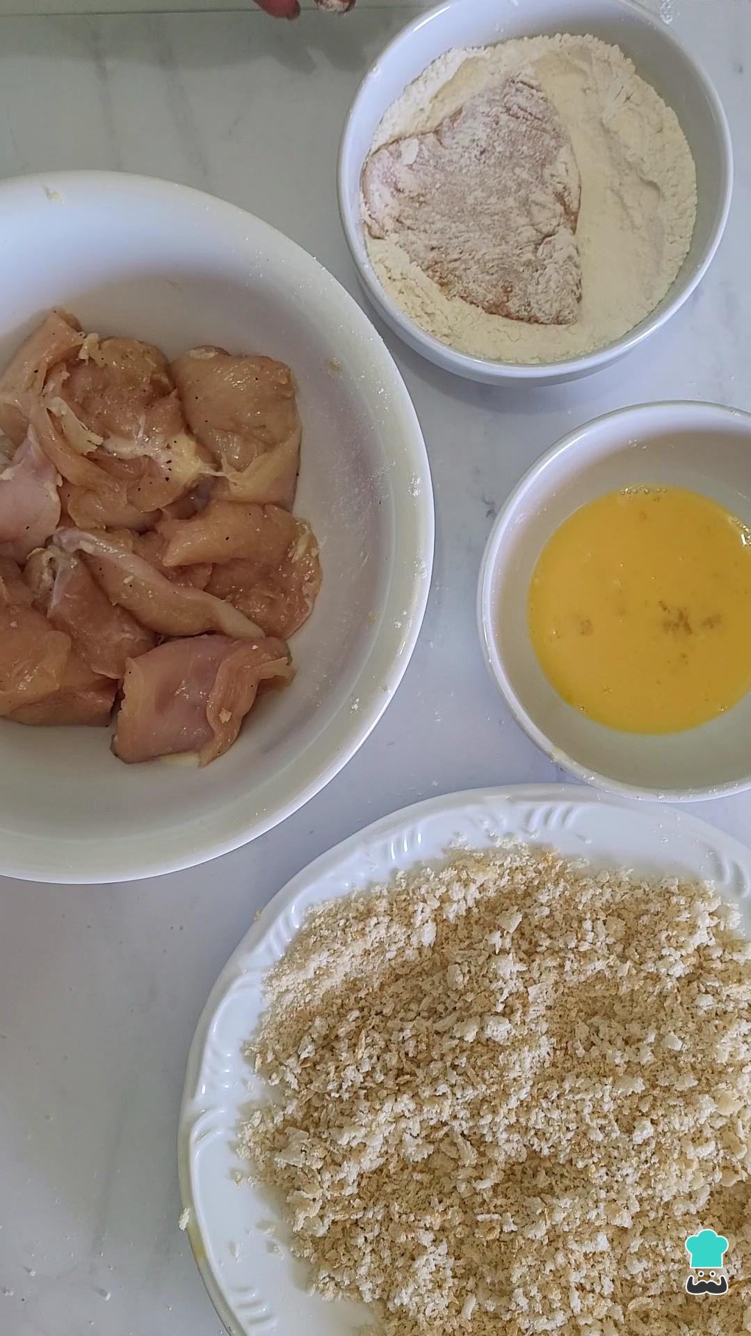 Dica: A farinha de trigo retira a umidade do ingrediente, o ovo forma uma película que impede que qualquer líquido saia na hora da fritura e a farinha panko dará a crocância necessária para deixar seu frango gostoso.