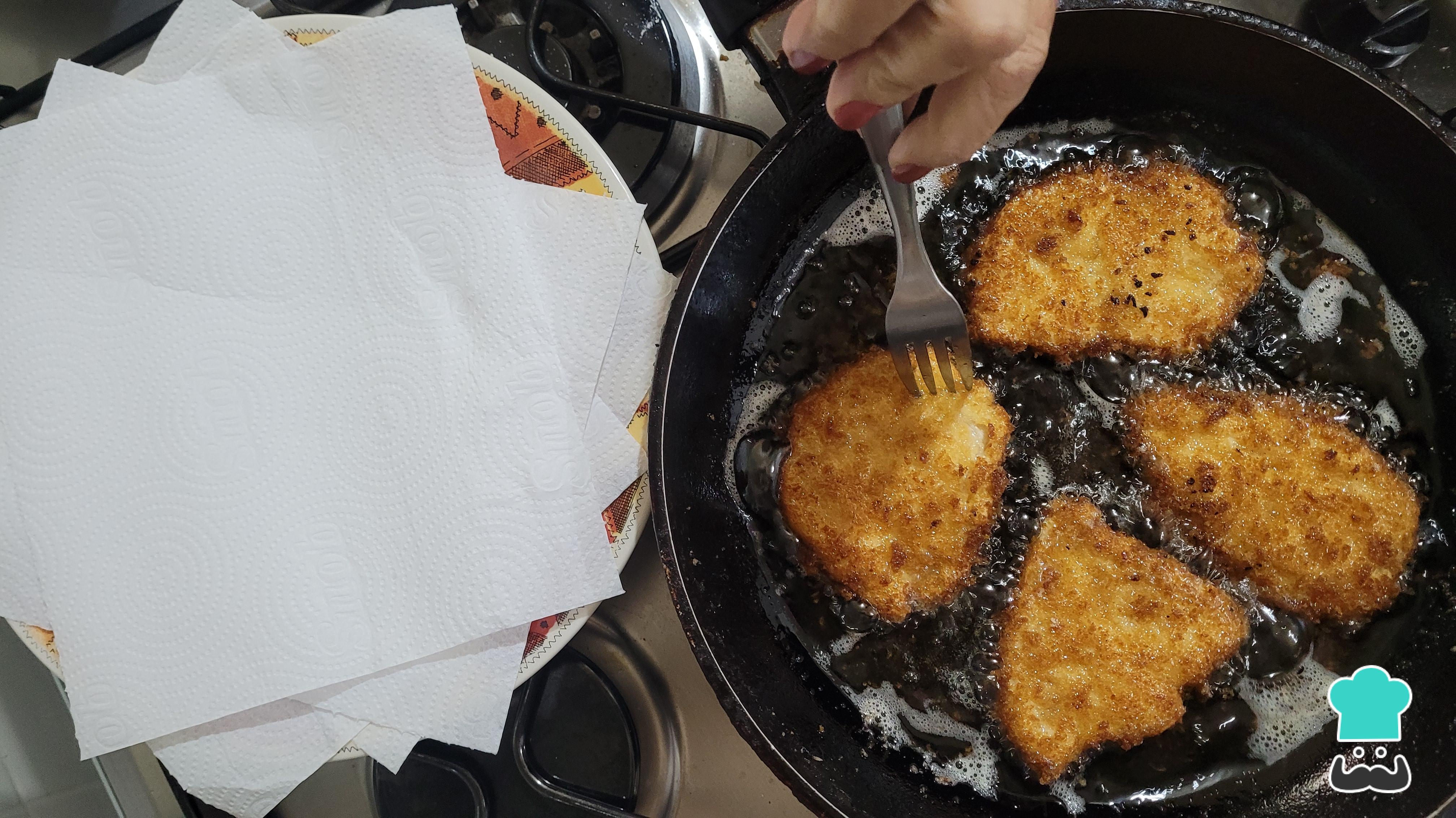 Quando estiver dourado dos dois lados, utilize uma escumadeira, retire o excesso de óleo e coloque em um recipiente com papel-toalha para escorrer e ficar mais sequinho.