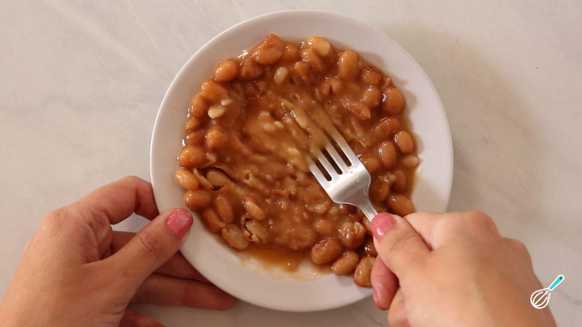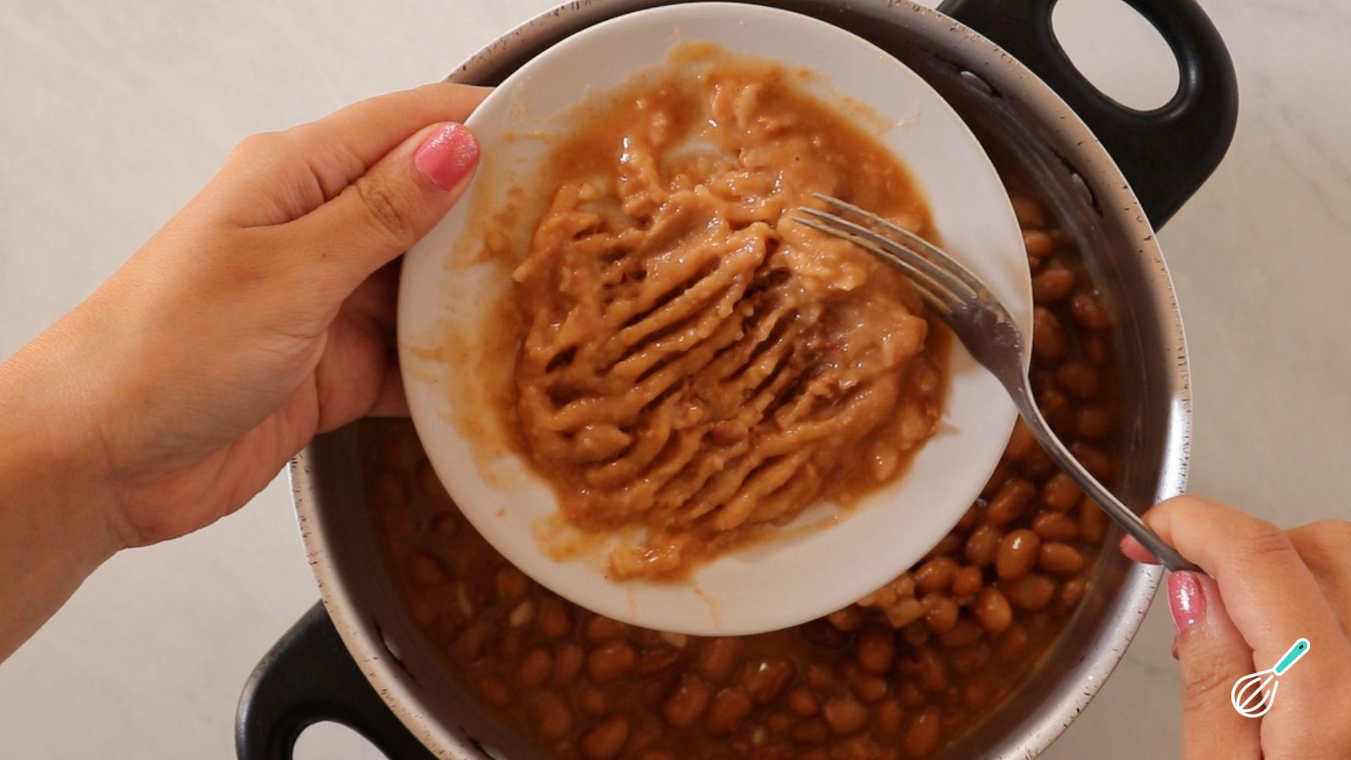 Separe duas colheres de sopa e amasse com um garfo - você também pode usar um mixer ou, se estiver preparando uma grande quantidade de feijão, bata no liquidificador.