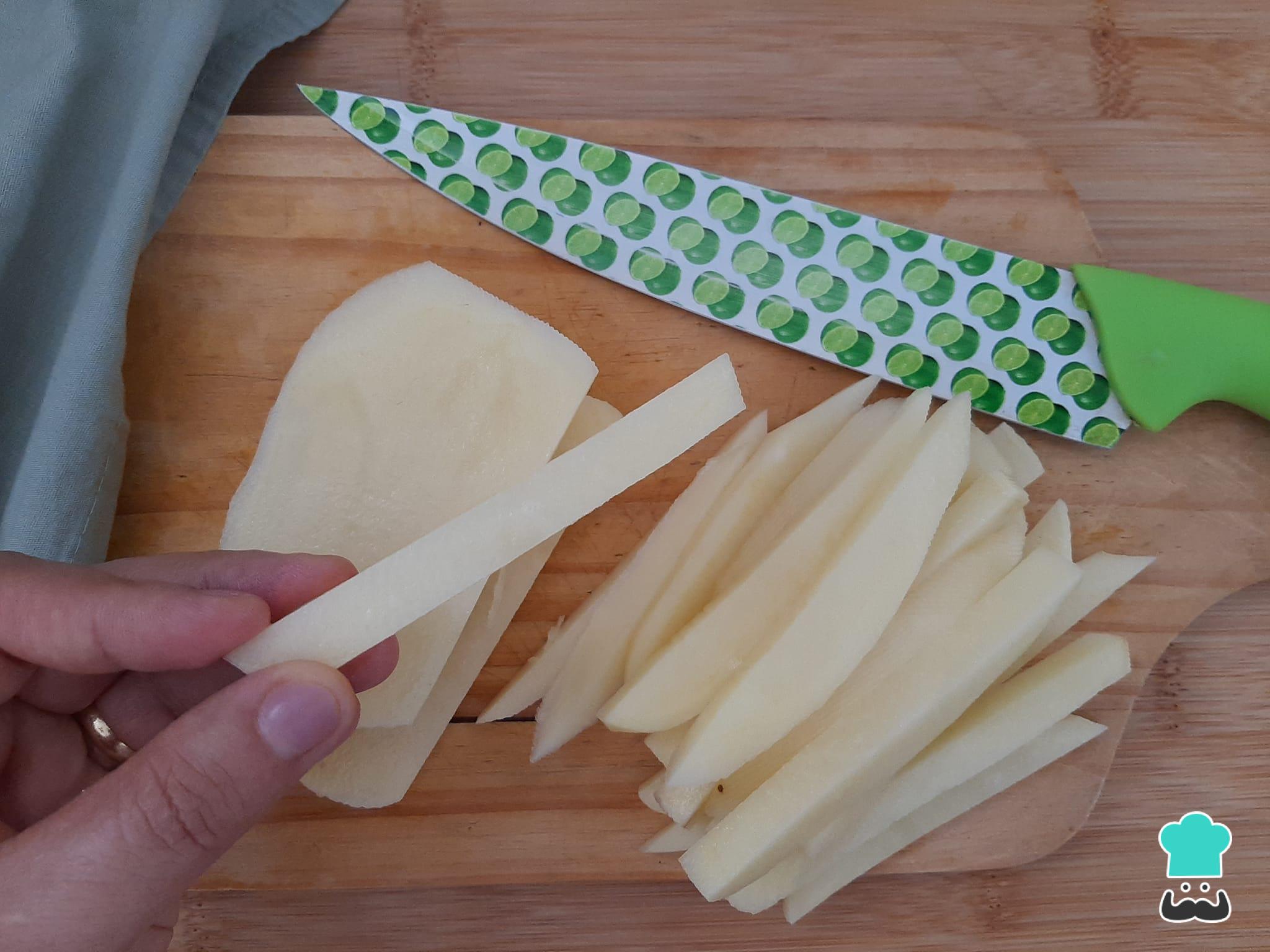 Descasque a batata e corte-a em palitos (nem muito fino, nem muito grosso).