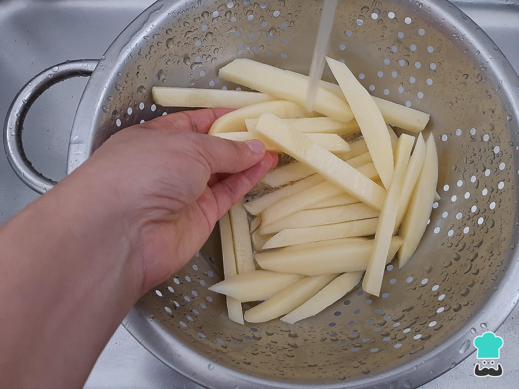 Depois disso, lave bastante os palitos de batata em água corrente ou se quiser, deixe-os de molho num bowl com água. Esse processo contribuirá para retirar o excesso de amido da batata.