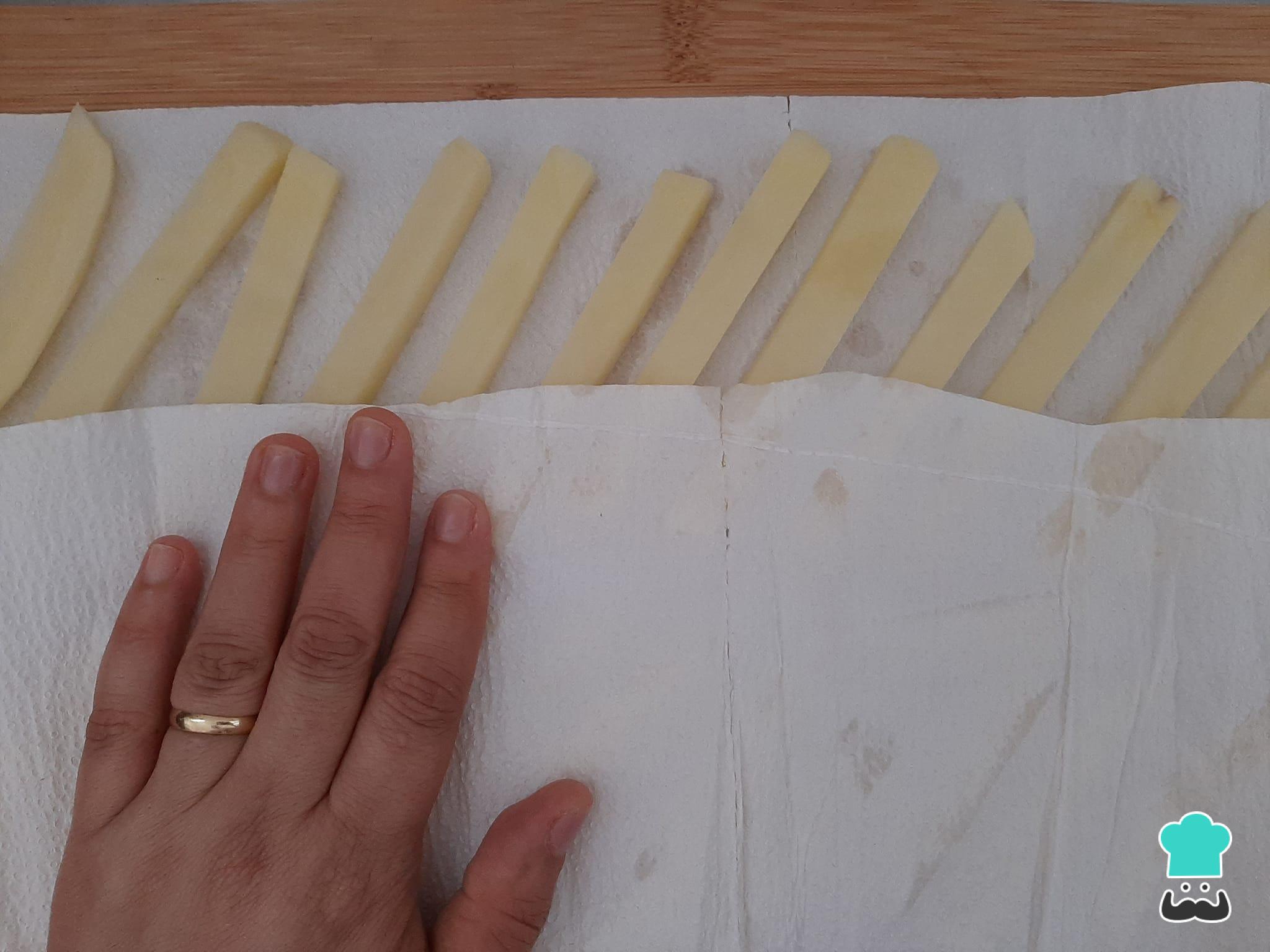 Depois que escorrer os palitos de batata, enxugue tudo muito bem, com um pano limpo ou papel toalha.