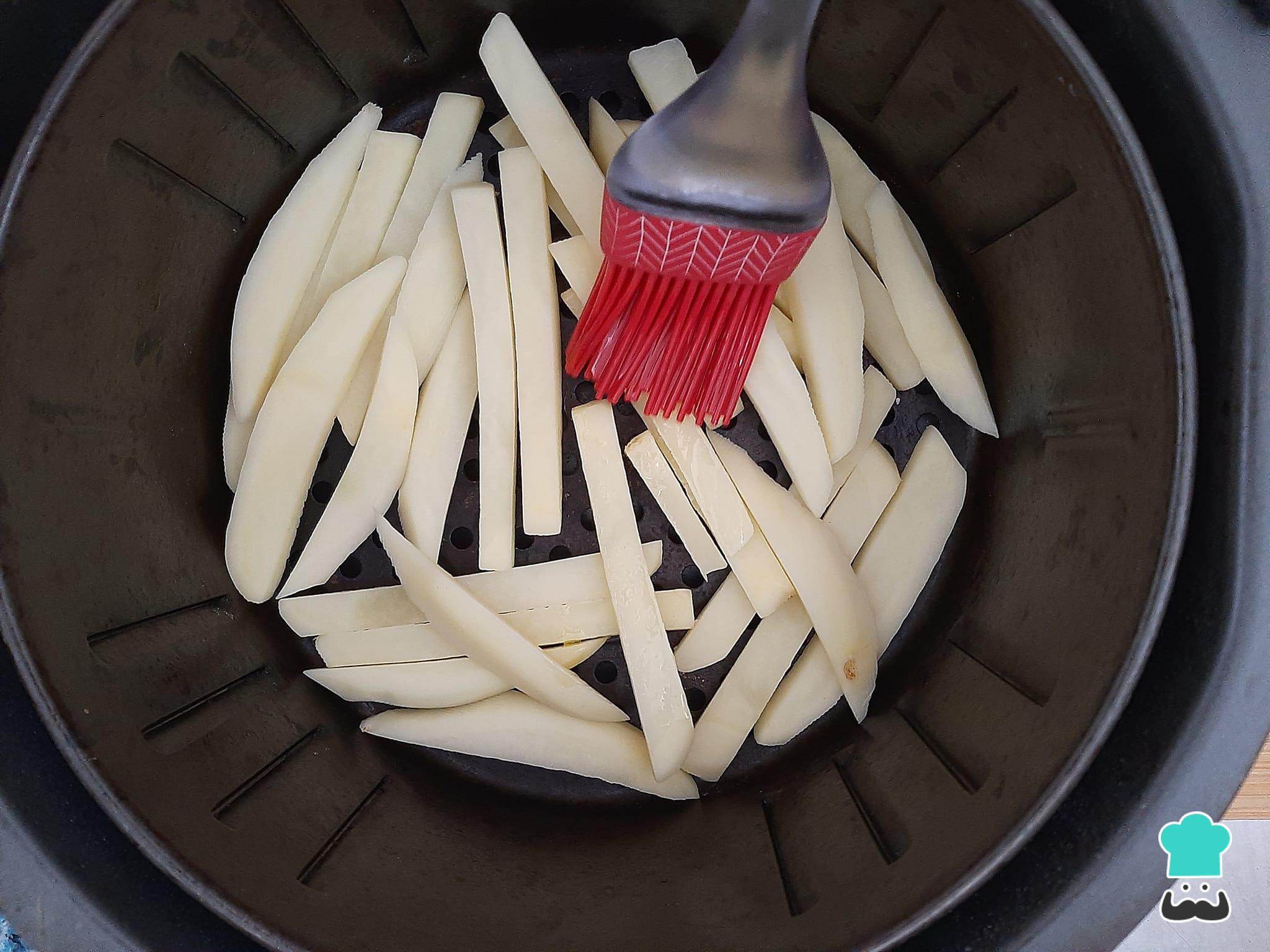 Acomode os palitos de batata na cesta da airfryer e pincele azeite de oliva sobre eles.