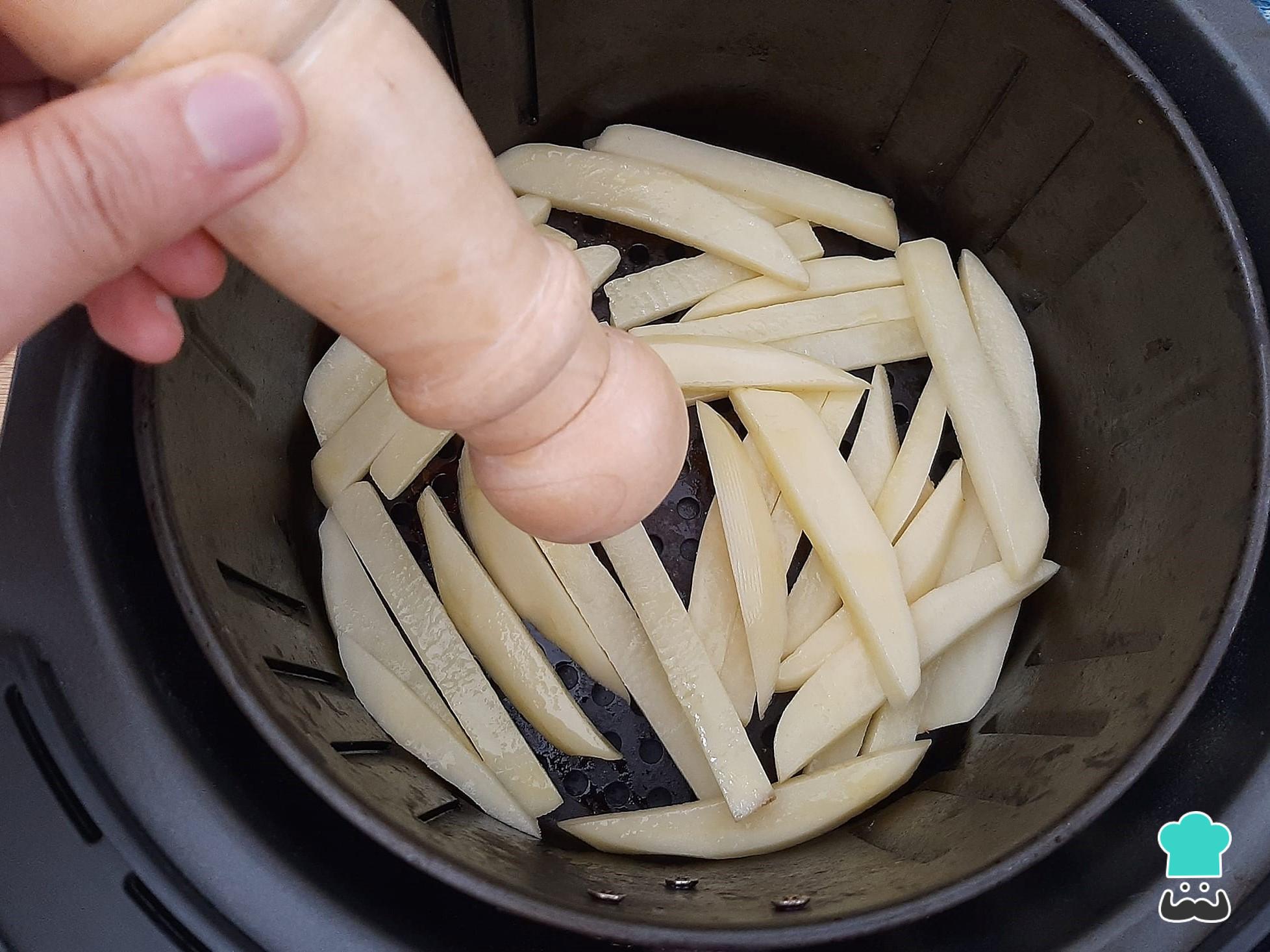 Dica: É muito importante que seque bem os palitos, pois isso irá garantir que a batata fique crocante. Enquanto faz isso, pré-aqueça a airfryer por 5 minutos a 180 graus.