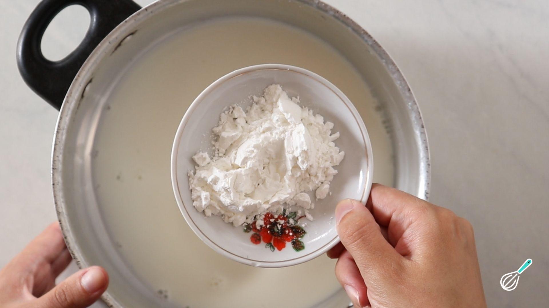 Comece adicionando o leite e o amido de milho em uma panela e mexa bem para dissolver o amido.