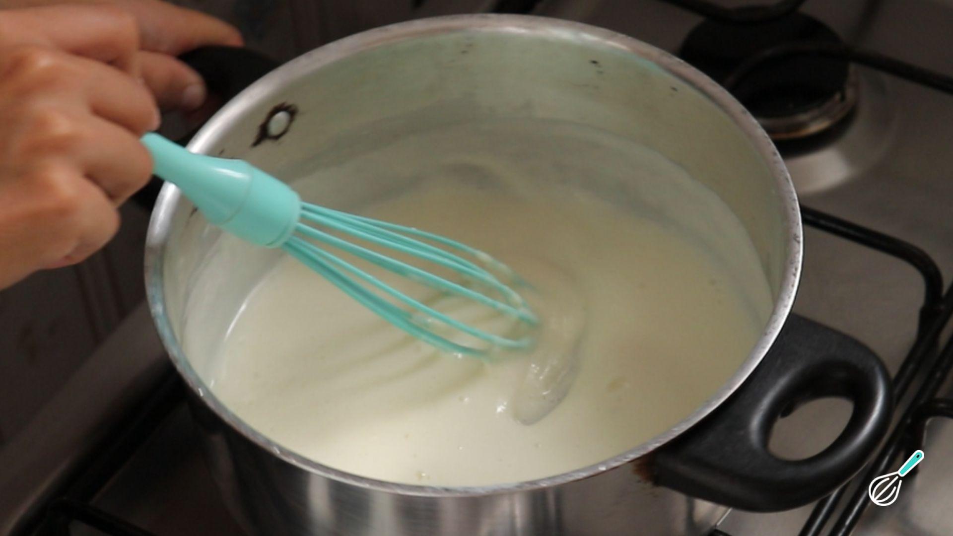 Leve ao fogo e cozinhe em fogo baixo, mexendo sempre. Quando começar a ferver, cozinhe por mais 3 minutos misturando vigorosamente para que o amido cozinhe e não deixe sabor residual.
