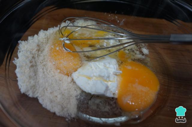 Em seguida, em uma tigela adicione a farinha de amêndoa, os 2 ovos, a manteiga derretida, o requeijão, o leite (de origem animal ou vegetal) e uma pitada de sal.