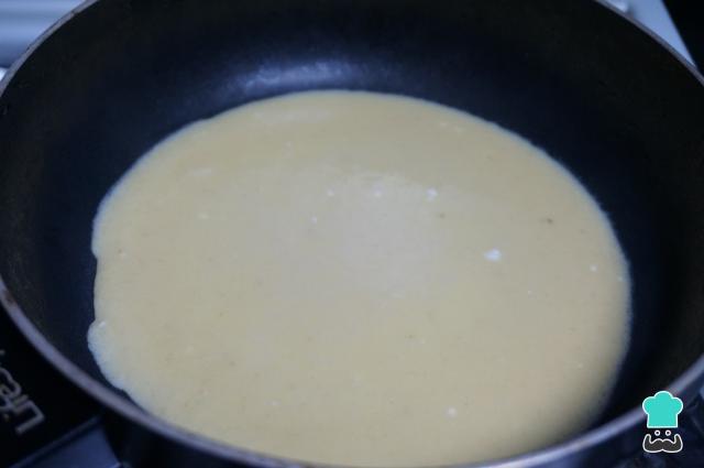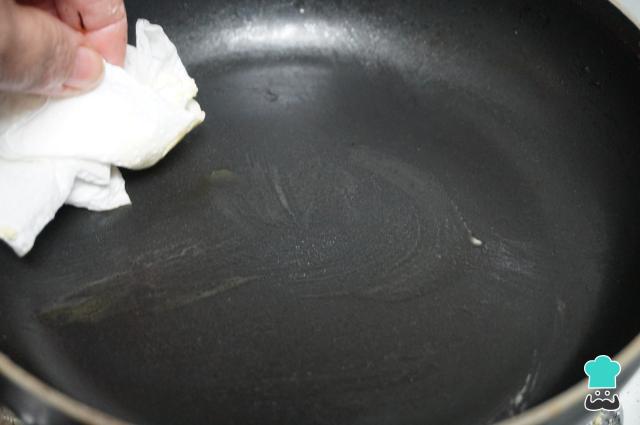 Coloque em uma frigideira antiaderente com fogo médio. Quando estiver quente, espalhe na base um pouco de manteiga. A manteiga pode ser espalhada com papel de cozinha.
